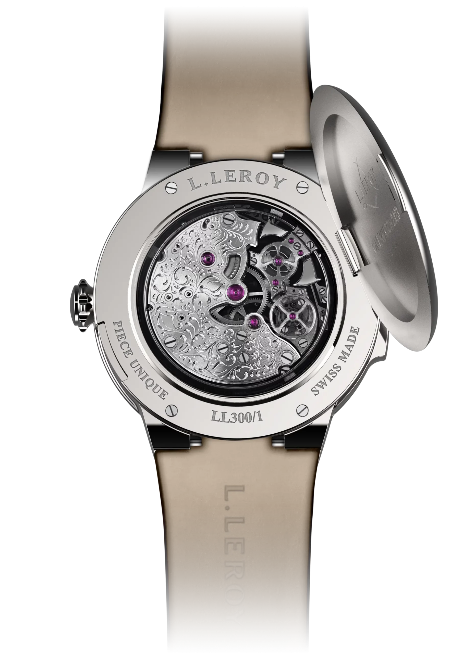 The L.Leroy minute repeater watch is fitted with an aquamarine calf leather strap, secured with a round-shaped open worked folding buckle, which is also made of 18K palladium white gold.