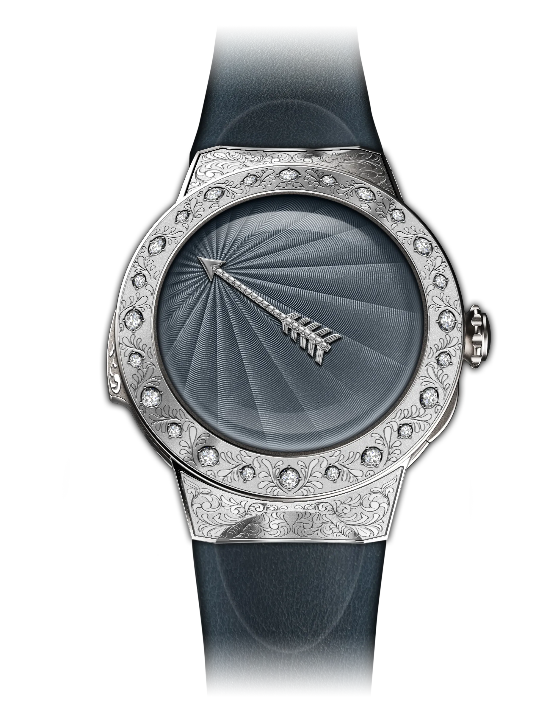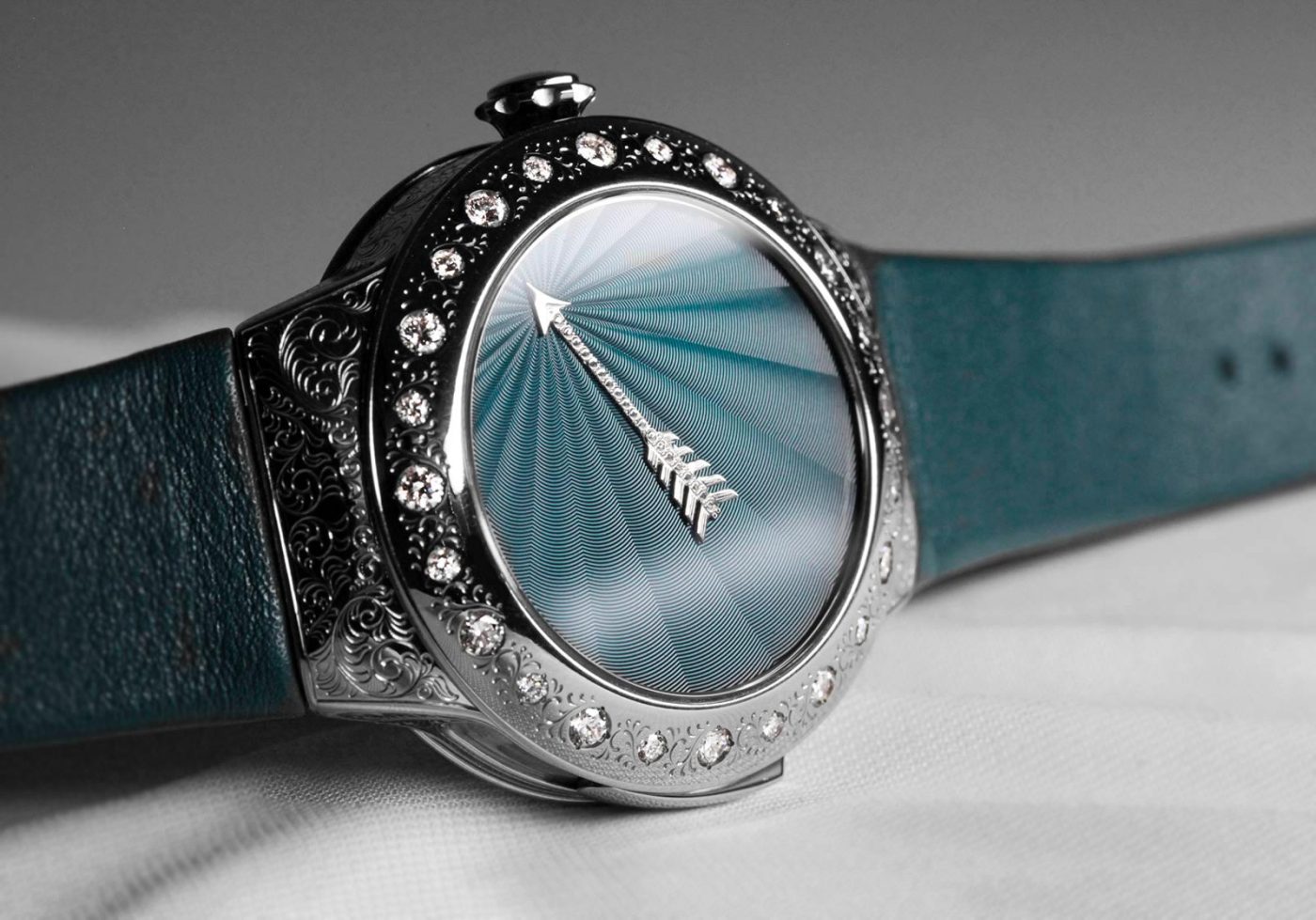 Rotating dial with flinqué soleil decoration and translucent aquamarine varnish finish, arrow-shaped rhodium-plated hour hand points to diamond-set hour markers.