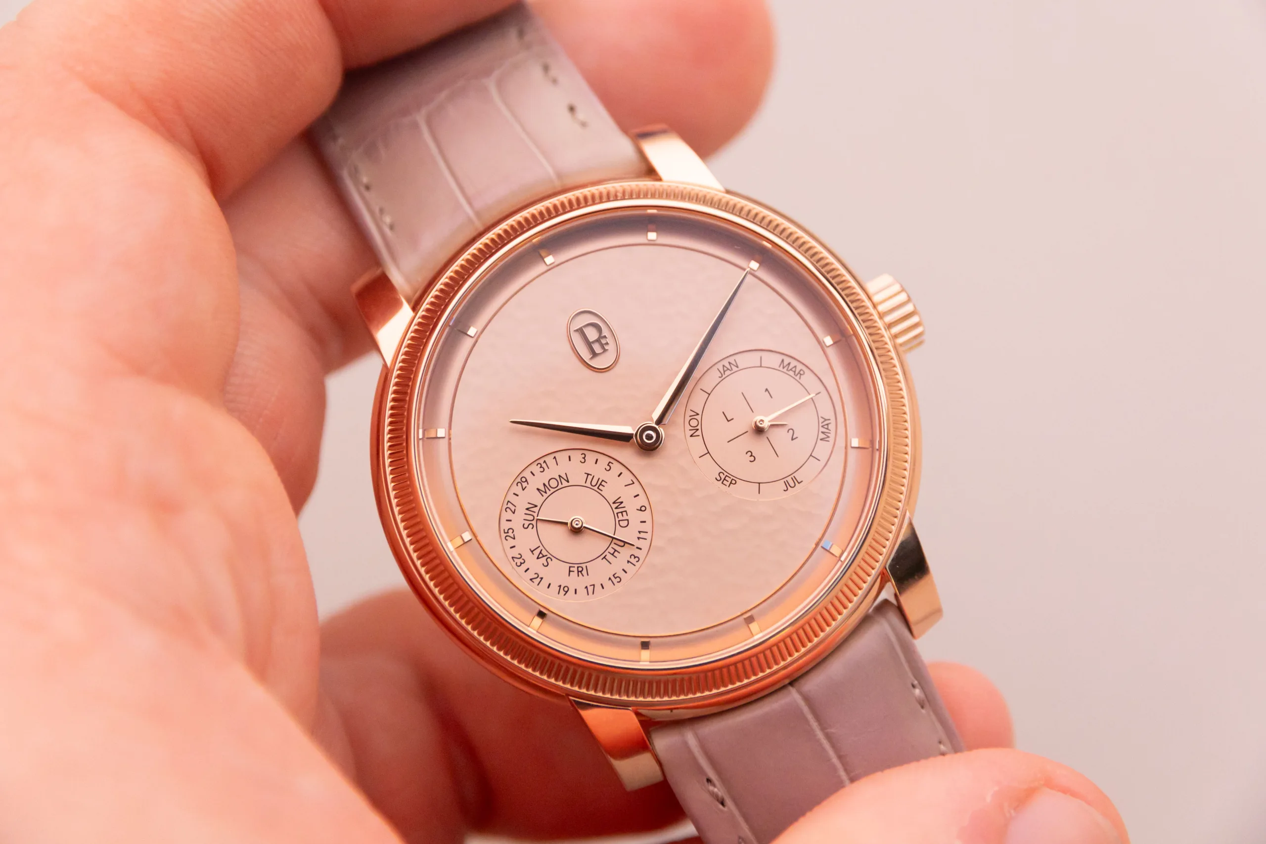 Both models are pure dress watches with a width of 38.5 mm wide. What is more impressive is the thickness of the watch at just 7.8 mm considering it has an automatic movement in its heart. Colour-coordinated, hand-stitched alligator leather straps with gold pink buckle in red brown for the pink-gold casing and dark brown for the white-gold casing emphasizes the elegant nature of these watches.