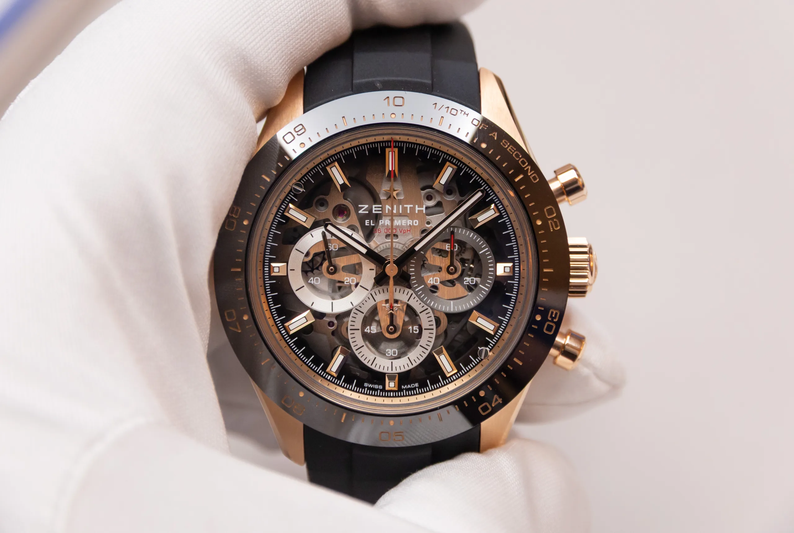 Protecting the dial is a flat sapphire crystal. The same type of crystal is also used for the display case-back.