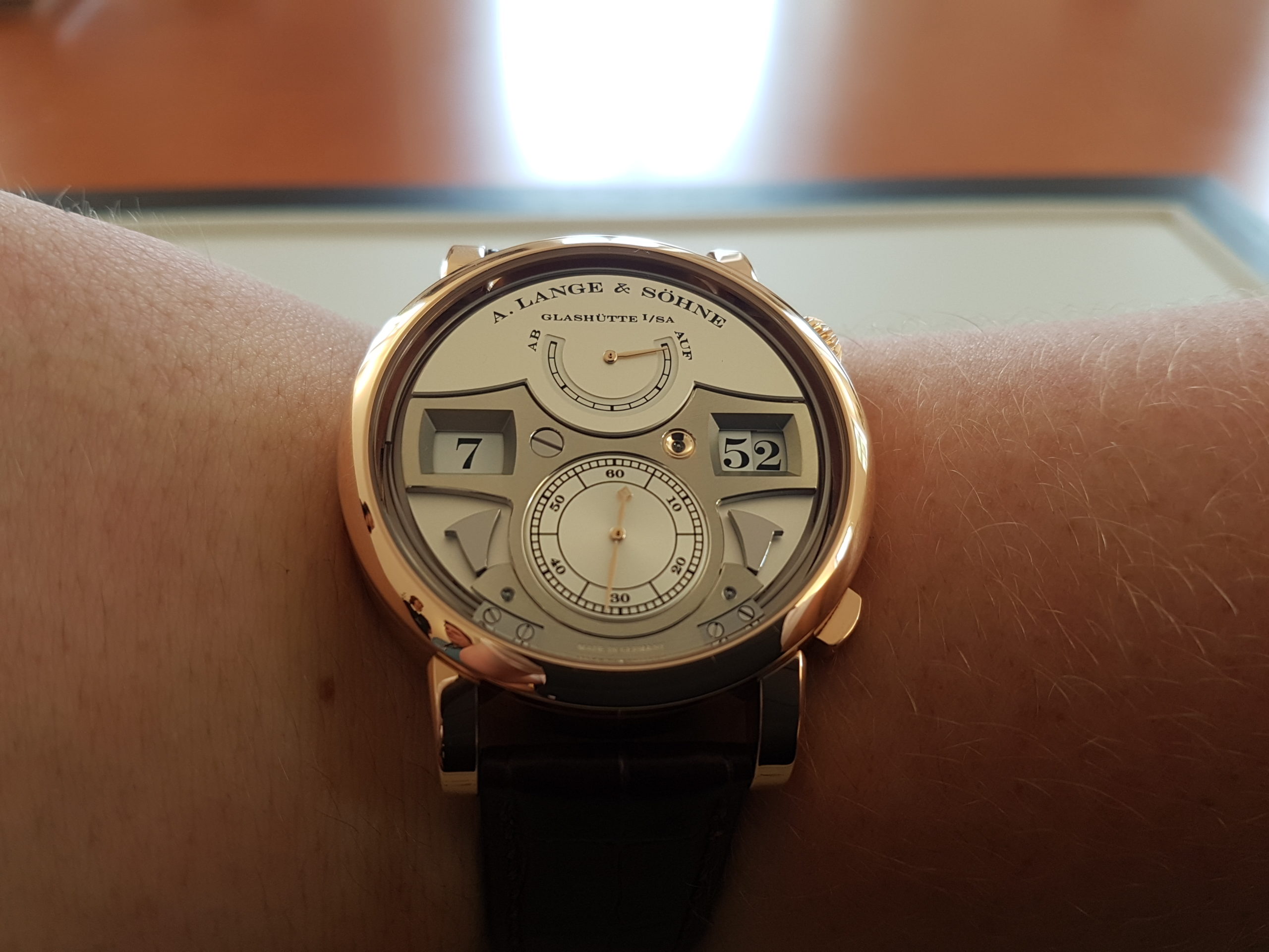 Lange laid out all of their current watches to view, sadly though we couldn’t make the 30 minutes we had stretch to take pictures and get to know every watch in the collection, so instead we focused on some of the highlights. We’ve already covered the Lange 31 and the Terraluna, and now it’s time for one of my personal favourites to take the spotlight, the Zeitwerk collection. The Zeitwerk collection of watches all differs from every other watch in that the do not make use of hands exclusively to tell the time. Instead, the time is shown by means of a set of wheels under the dial with a mechanism similar to that of the Outsize Date being used to control them accurately.
