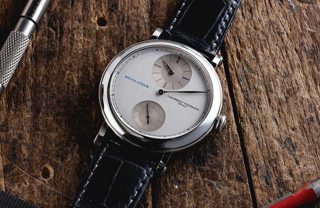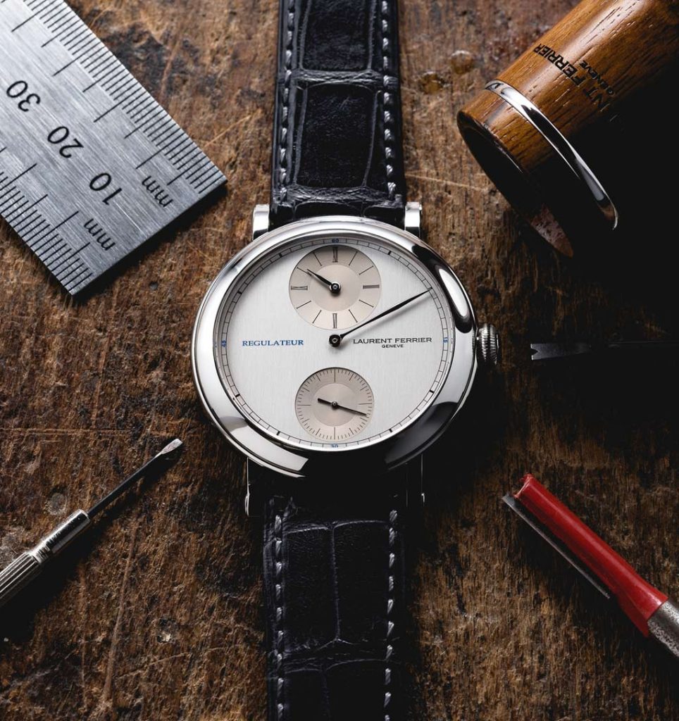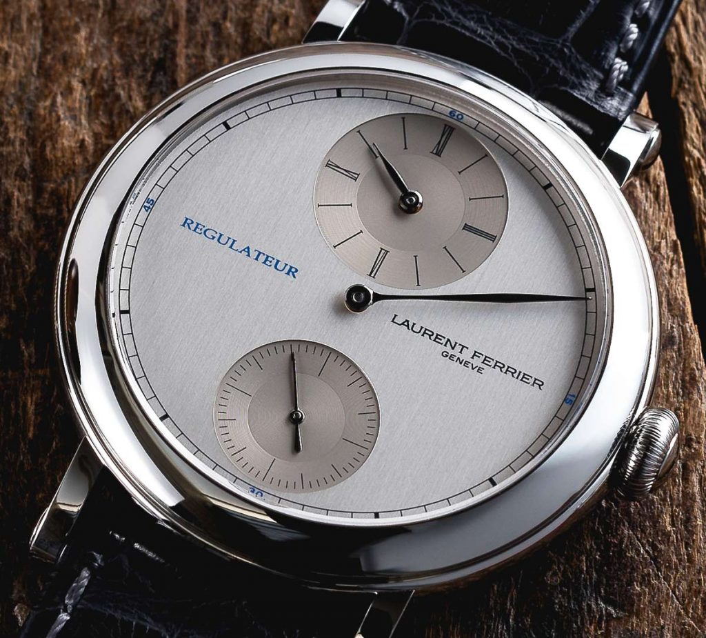 The dial sports a silver tone which is very tantalizing to look at. It has a vertical satin-brushed finish with the minute and seconds counters recessed and contracted with a nickel snailed finish making the sub-dials blend so well. The branding is very minimalist too with a blue REGULATEUR label at 9 o’clock while LAURENT FERRIER GENEVE is placed at 3 o’clock.