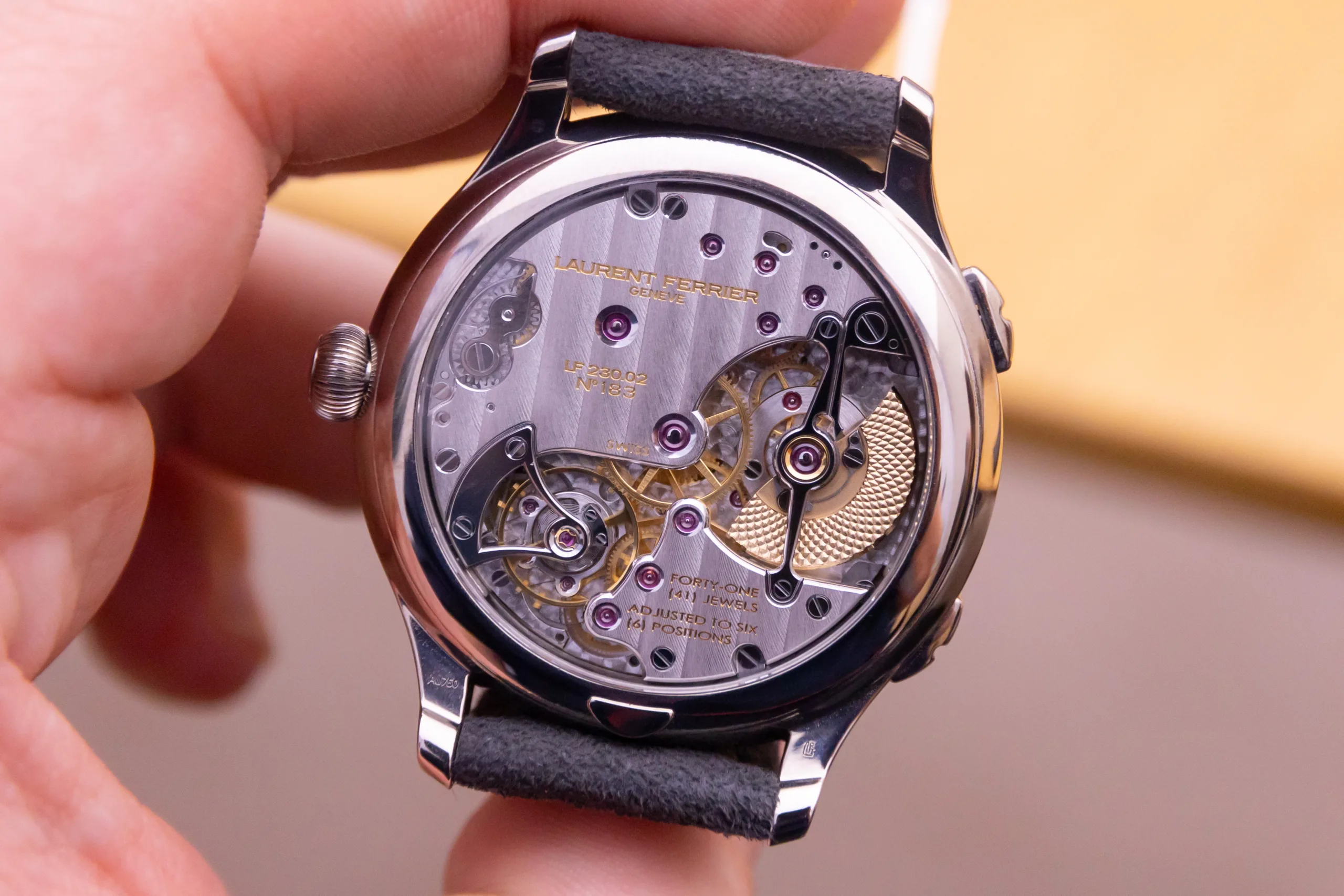 Inside, the automatic LF230.02 calibre runs at 21,600vph with a 72-hour power reserve. It has a gold micro-rotor with pawl-fitted unidirectional winding and a natural escapement with double direct impulse on the balance. Visible through the sapphire caseback, it features fine hand-finishing and an integrated GMT module.