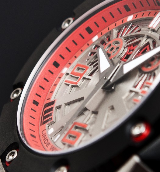 The new bold red beauty has the same bulkiness of the Oktopus II Double Date family, but adds some new details, with a five part 44mm titanium case, two laser-cut date wheels, and the LW04 caliber (Customized Dubois Dépraz caliber 14580).