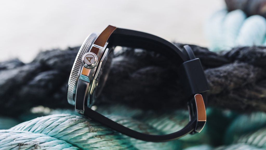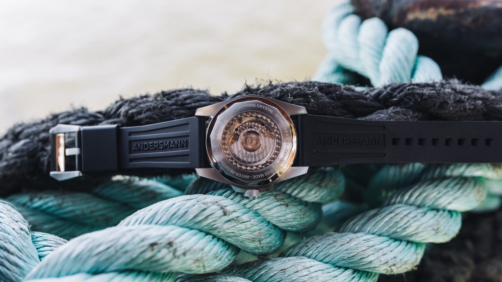 Held securely on top of the case is a dual curved sapphire crystal which has a thick anti-reflective coating that works well for the most part and the dial is quite legible at various angles with minimum distortion. Surprisingly though this 1000-meter dive watch also has a 4,5mm sapphire glass on its back. While an exhibition case back on a dive watch might be a little concerning for some of you let me assure you that Andersmann has taken great care of getting this watch professionally tested by a Swiss laboratory for water resistance.  Reliability aside the sapphire case back brings forth a great view of the mechanical powerhouse behind this watch.