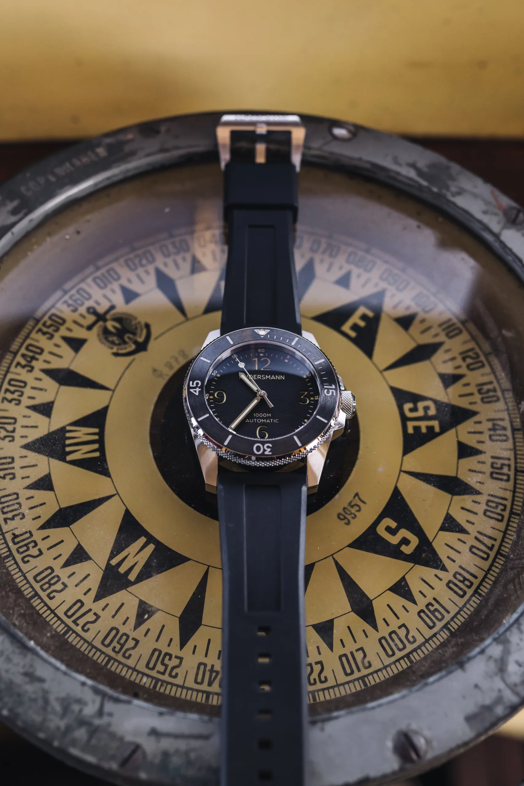Held securely on top of the case is a dual curved sapphire crystal which has a thick anti-reflective coating that works well for the most part and the dial is quite legible at various angles with minimum distortion. Surprisingly though this 1000-meter dive watch also has a 4,5mm sapphire glass on its back. While an exhibition case back on a dive watch might be a little concerning for some of you let me assure you that Andersmann has taken great care of getting this watch professionally tested by a Swiss laboratory for water resistance. Reliability aside the sapphire case back brings forth a great view of the mechanical powerhouse behind this watch.