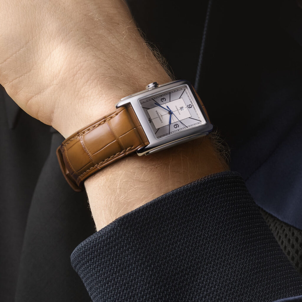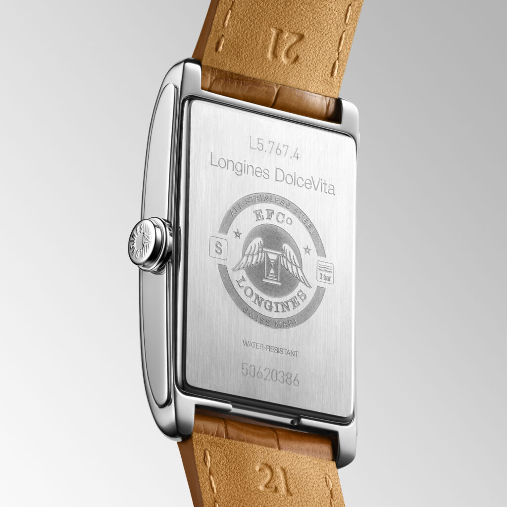 The rectangular stainless steel case is fully polished and measures 47mm x 28.2mm. Over the dial is a curved piece of sapphire crystal and around the back is a solid steel caseback with a classic Longines logo on it. Underneath that caseback is the calibre L592, a circular movement based on the ETA A20.L011. That means you get a 45-hour power reserve and a 4Hz beat rate.