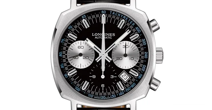 The cushion-shape of this model is completed by the rounded push-pieces, and the watch is also mounted on a black alligator strap. You can find more information via the Longines website.