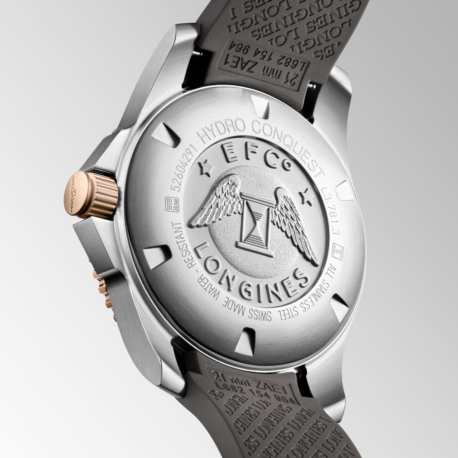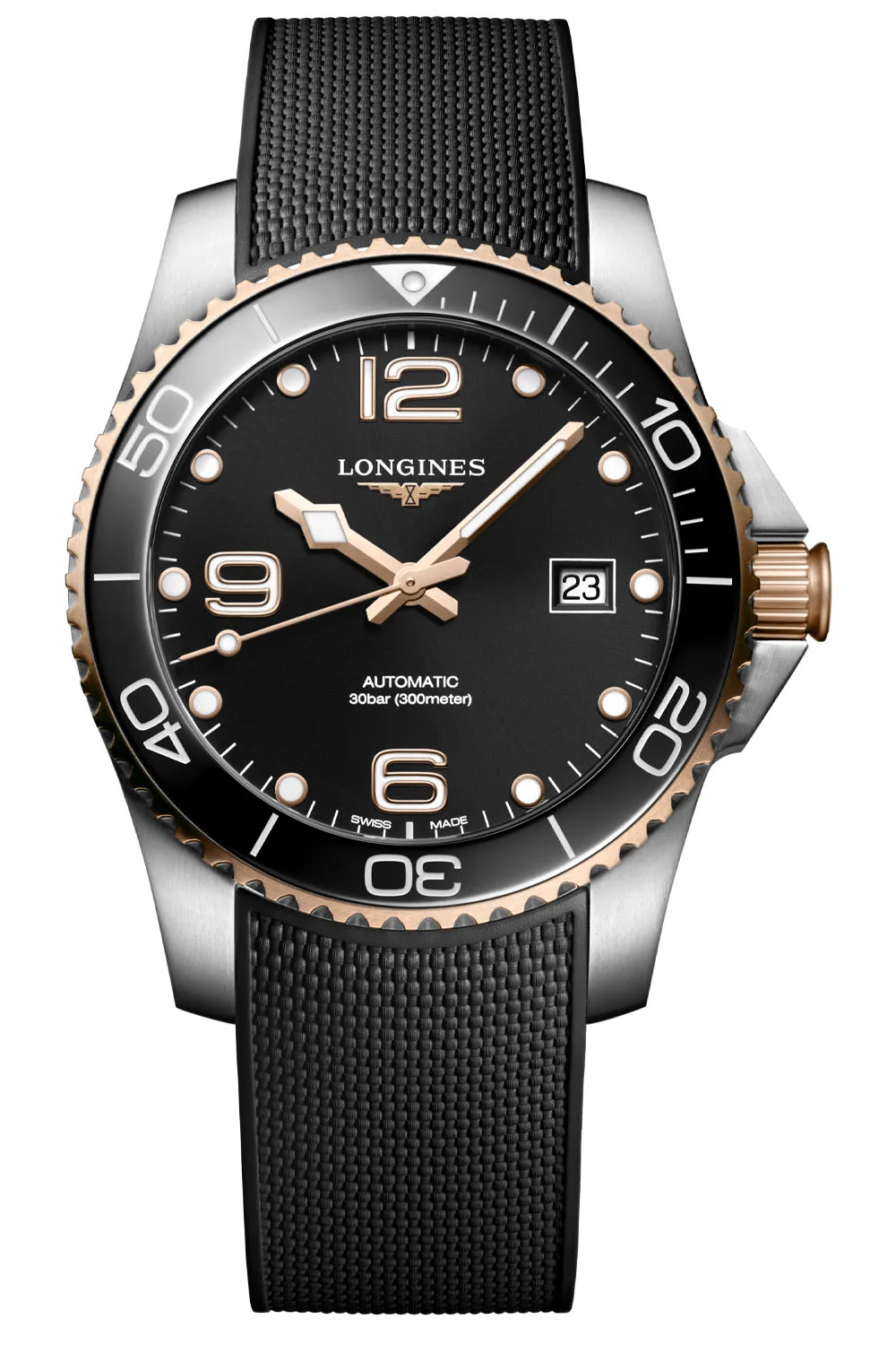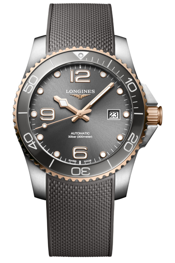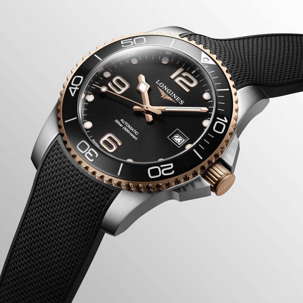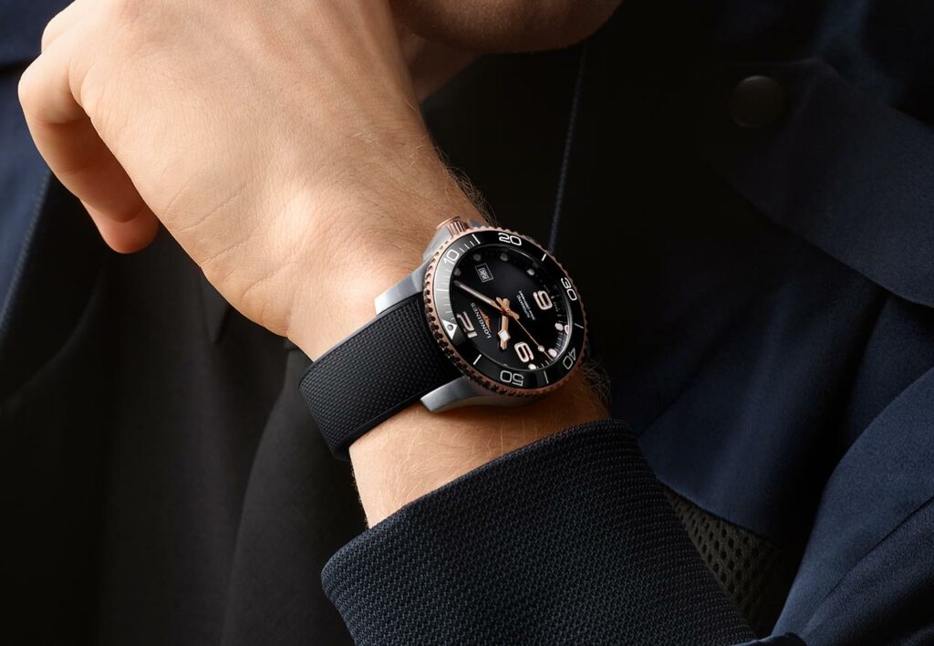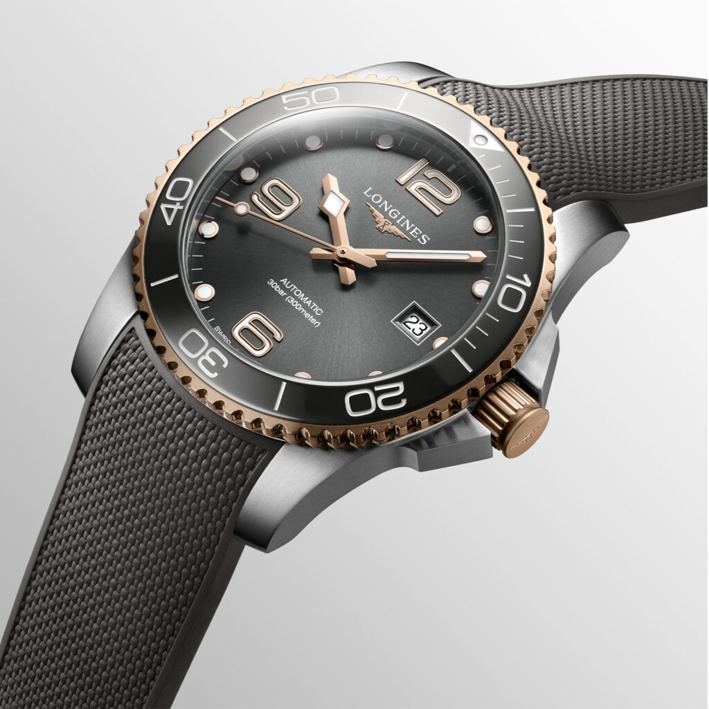 The new HydroConmquest keeps the 41mm case we’ve seen before. The base metal is stainless steel, but Longines has added some oomph to the design with a small addition of PVD gold. Whilst you may be disappointed that it doesn’t use solid gold, remember that solid gold is expensive and easily dented due to its malleability. This watch, therefore, provides the best of both worlds.