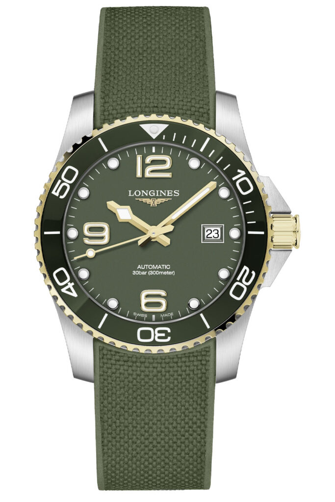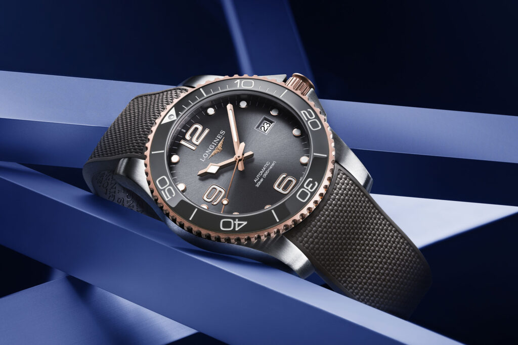 I should correct myself there and say these watches. Longines is releasing several models that come with a PVD gold bezel, crown and dial affair. Three of them come with a PVD yellow gold details, these come either a blue, black or green dial and bezel combination. Black and grey versions are also available with red gold PVD. Rubber straps a fabric pattern are available as well as a two-tone bracelet with more PVD gold.