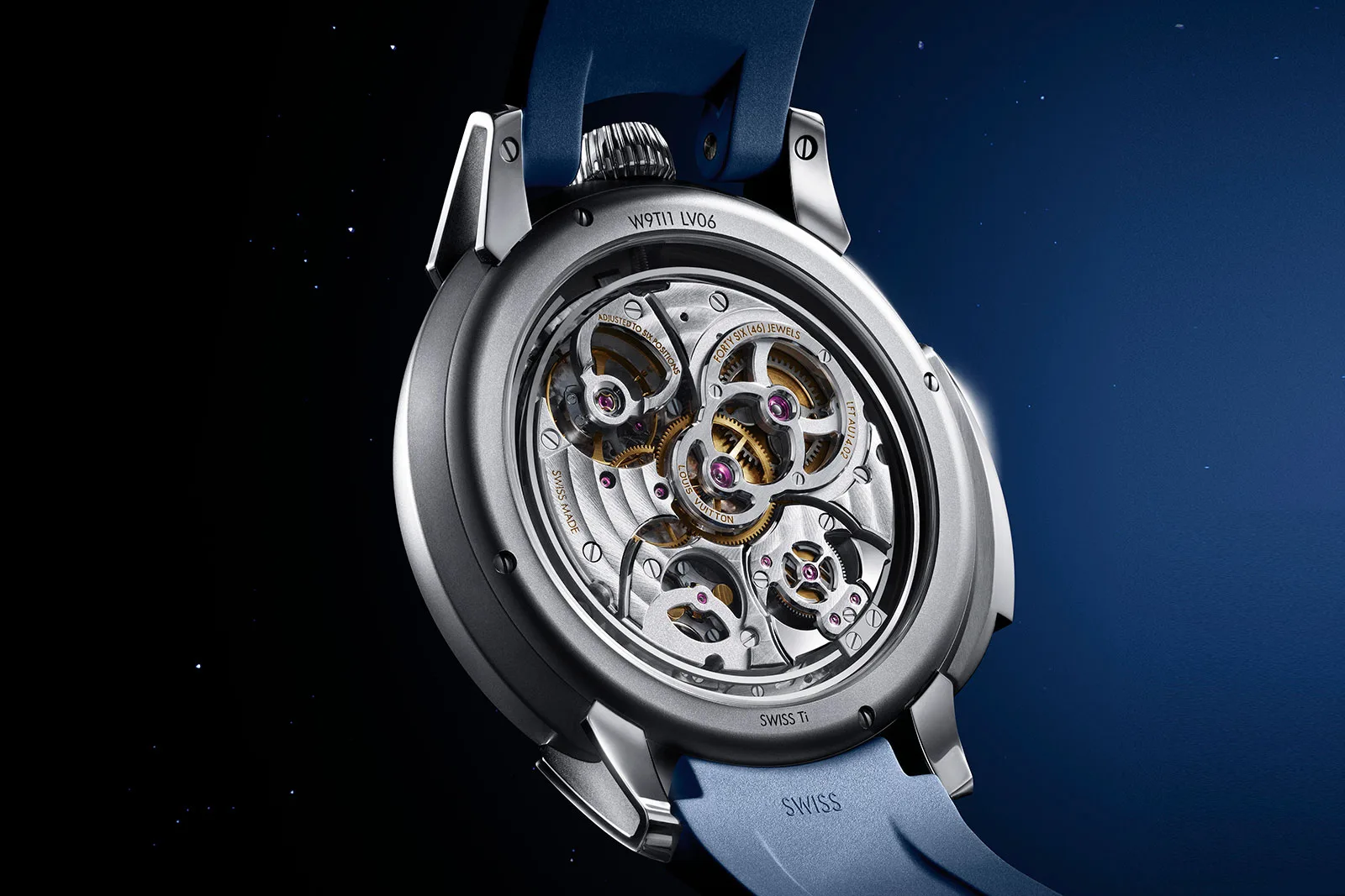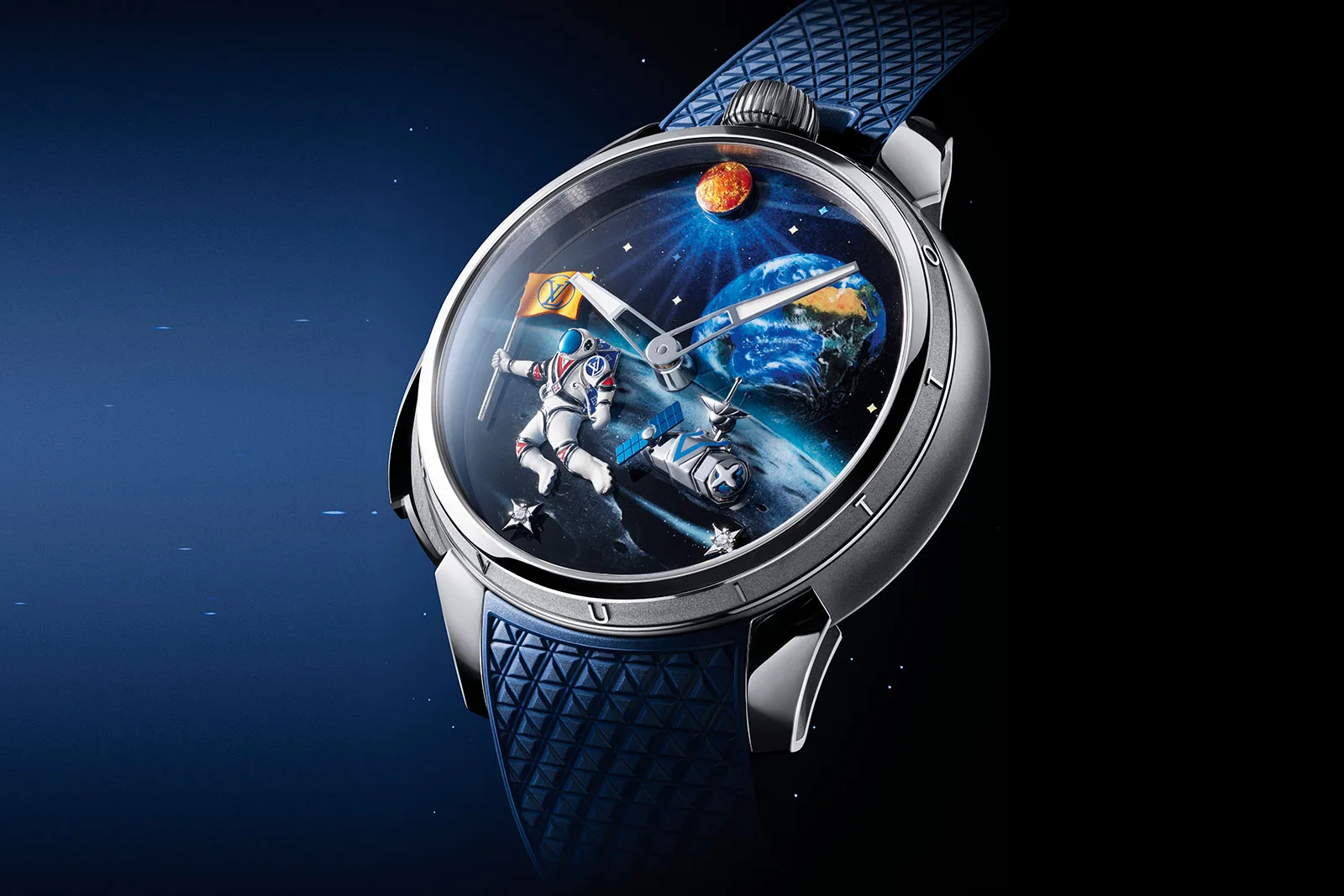 Bigger still at 46.7mm x 14.6mm, this one features a case of white gold and titanium. The dial is a showpiece of multiple enameling styles, depicting an astronaut on the moon, LV flag in hand. Engage the slide and a minute repeater chimes as the astronaut animates, satellites whir and stars oscillate. The LFT AU 14.02 movement inside is composed of 459 parts with 100 hours of power and decorated with a mix of Côtes de Genève, brushed and frosted finishes. Though the brand hasn’t listed a retail price, the watch is said to cost north of $1 million.