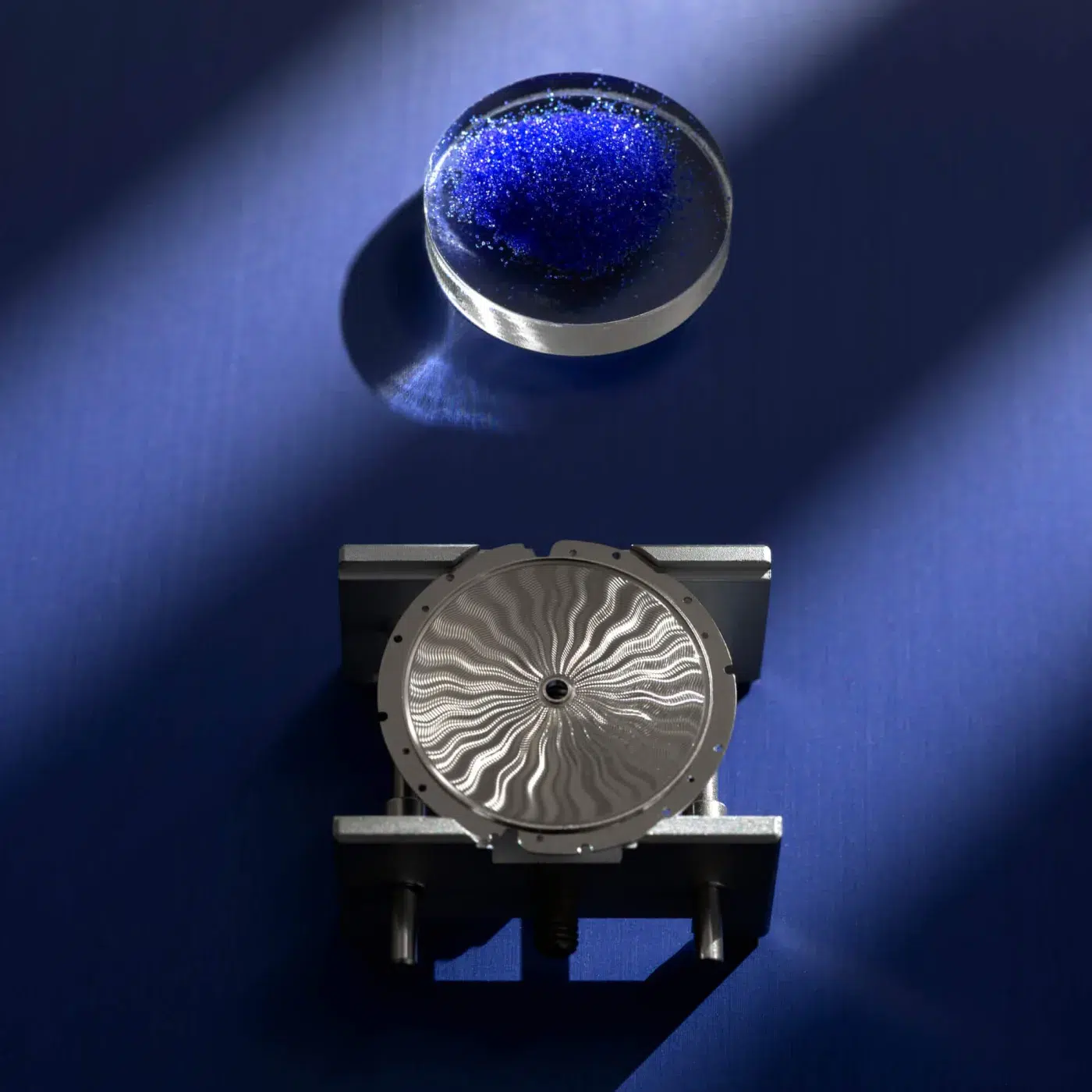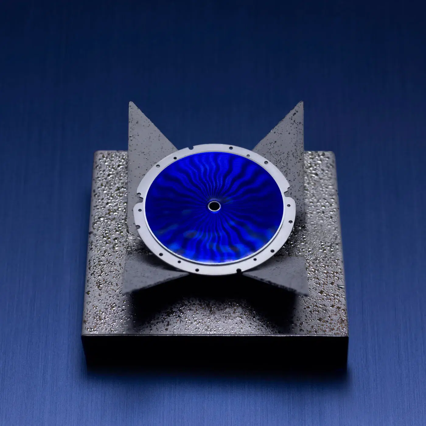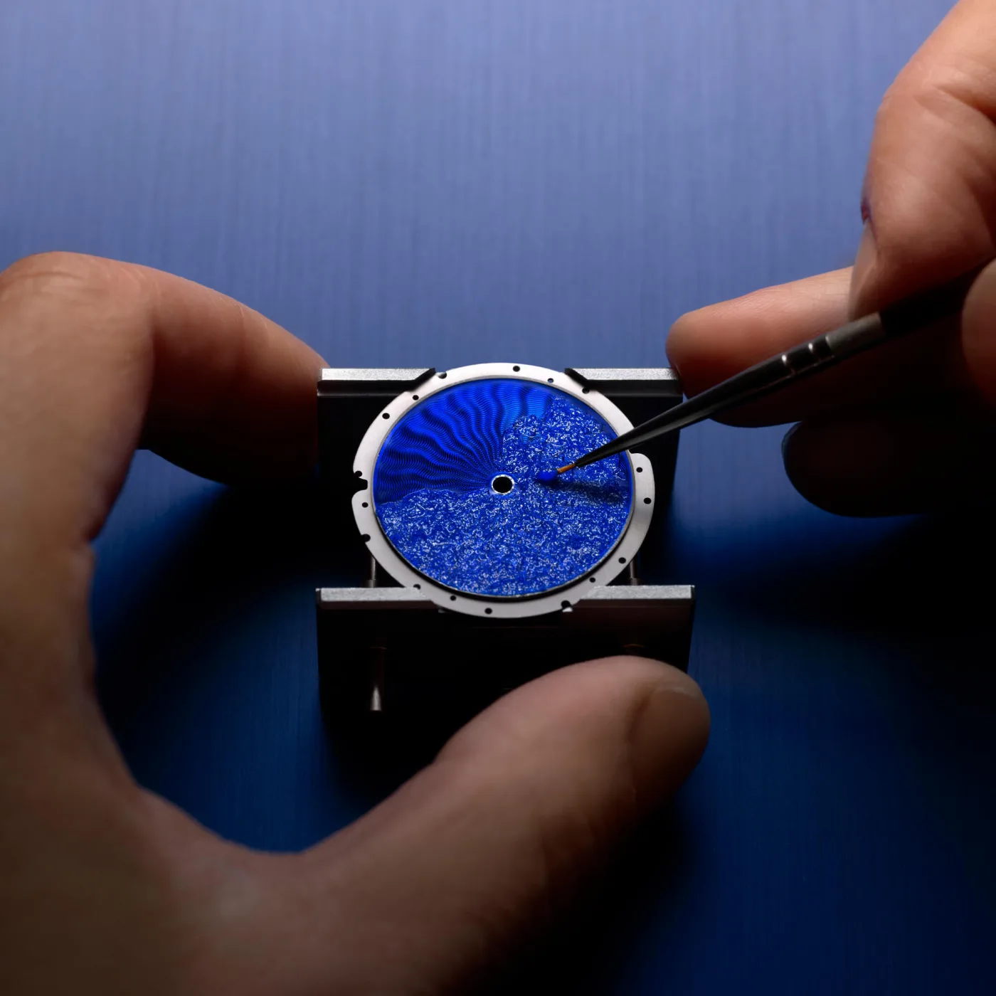 Taking a total of 4 detailed artisans to complete, each dial is a stunning combination of a gold base, a brushed flange around the perimeter housing blue dot hour markers, 18k white gold plated hands, and radiant hand-etched guilloché decoration. Champlevé and Flinqué enamel processes are overseen by the artisans to render each surface in a vivid translucent blue that allows the patterning to stay visible on the surface which is then finished with a diamond polishing paste achieving a mirror-like shine.