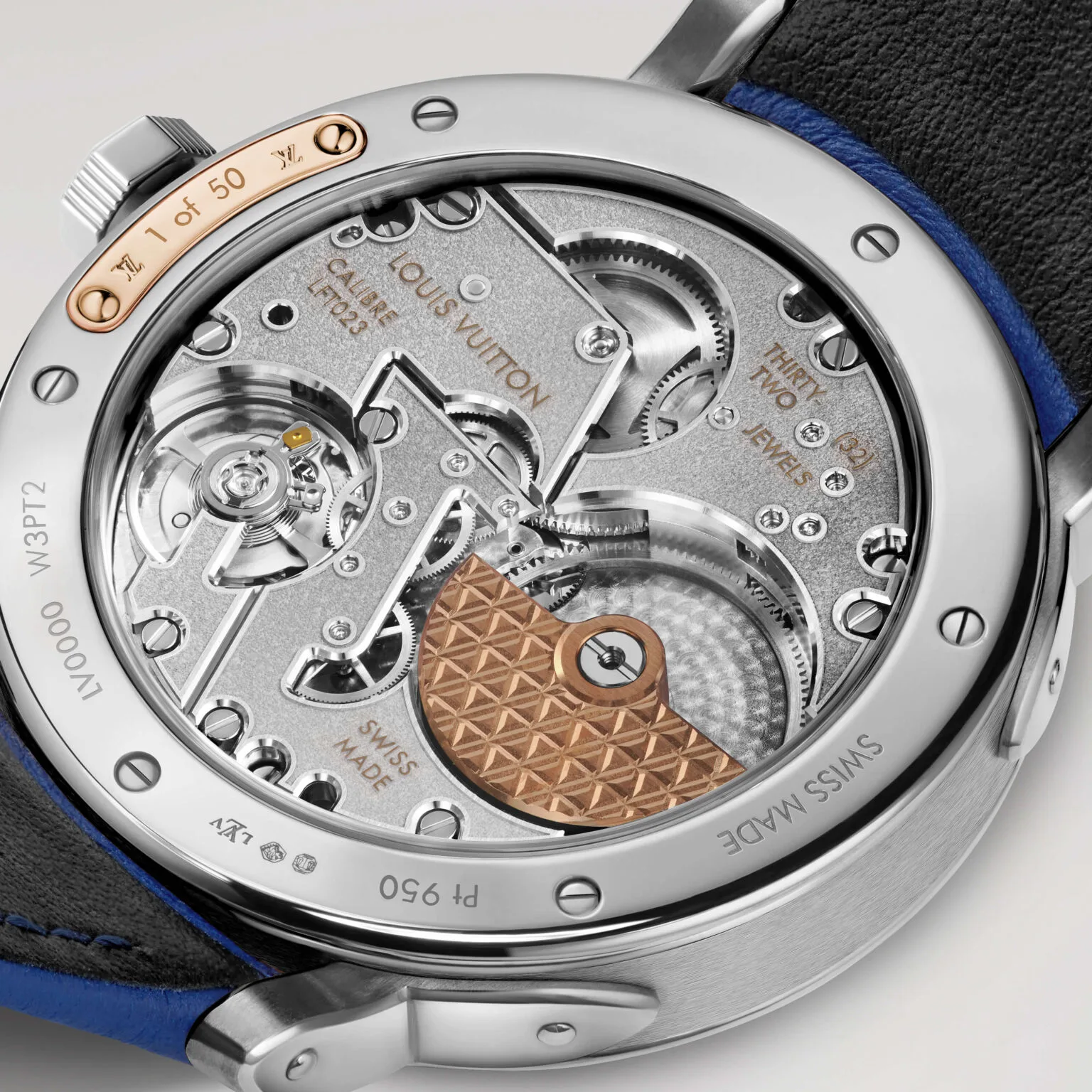 The Escale W3PT21 maintains a full platinum case finished with a cadence of high polish and horizontal brushing across the fixed bezel, riveted lugs, and octagonal Louis Vuitton embossed crown which affords 50m of water resistance.
