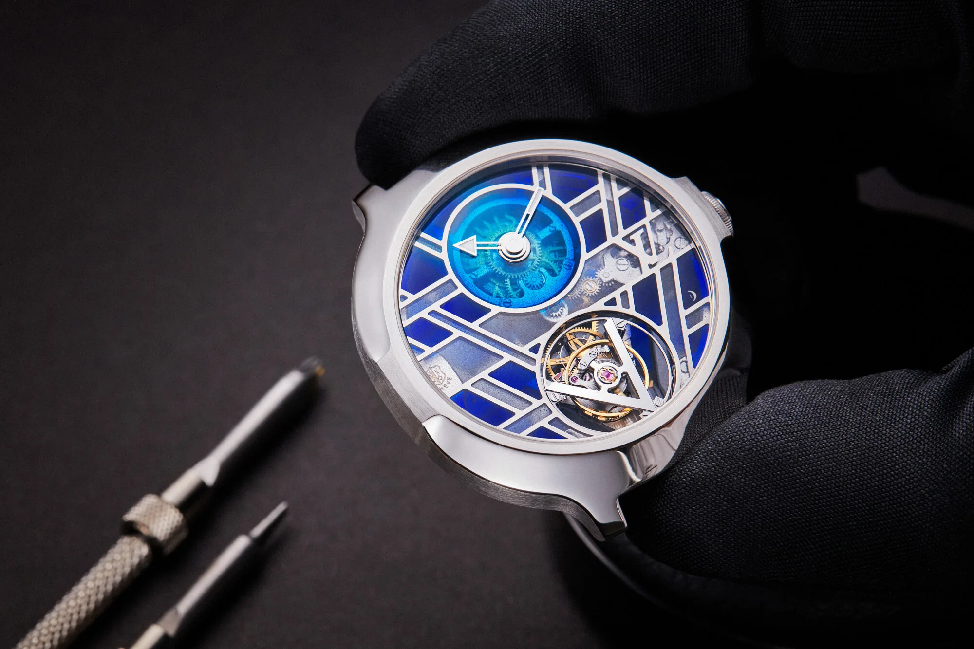 Following its successful iterations as a minute repeater, a bedazzled and a skeletonized timepiece, the Louis Vuitton Voyager takes another bold step forward with the introduction of the Voyager Flying Tourbillon Plique-à-jour. This new iteration seamlessly blends artistic expression with intricate watchmaking, resulting in a truly unique wrist statement.