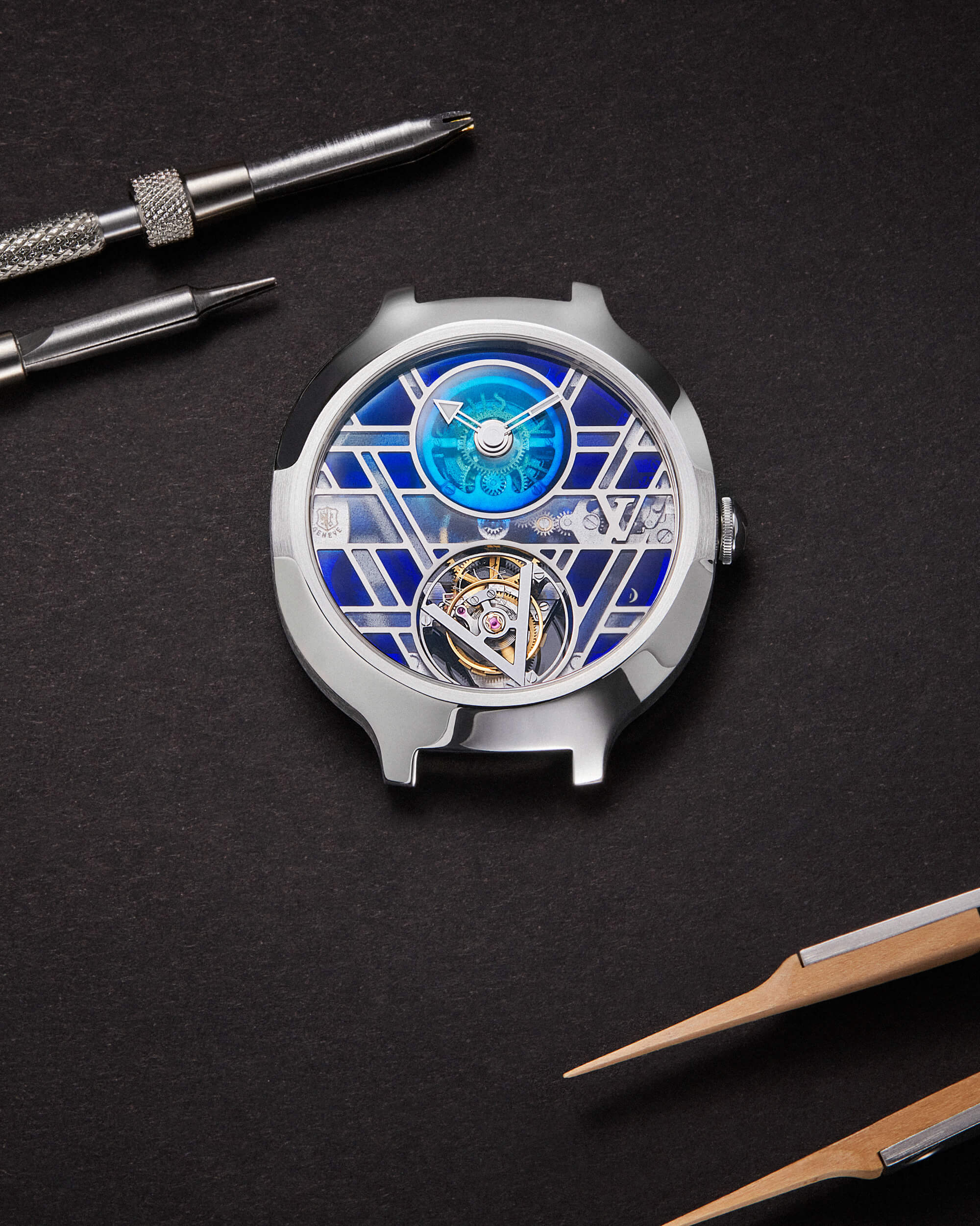 Powering the Voyager Flying Tourbillon Pique-à-jour is the hand-wound LV 104 movement. This 168-piece caliber boasts a robust 80-hour power reserve and beats at a traditional 3Hz (21,600 vph) frequency.