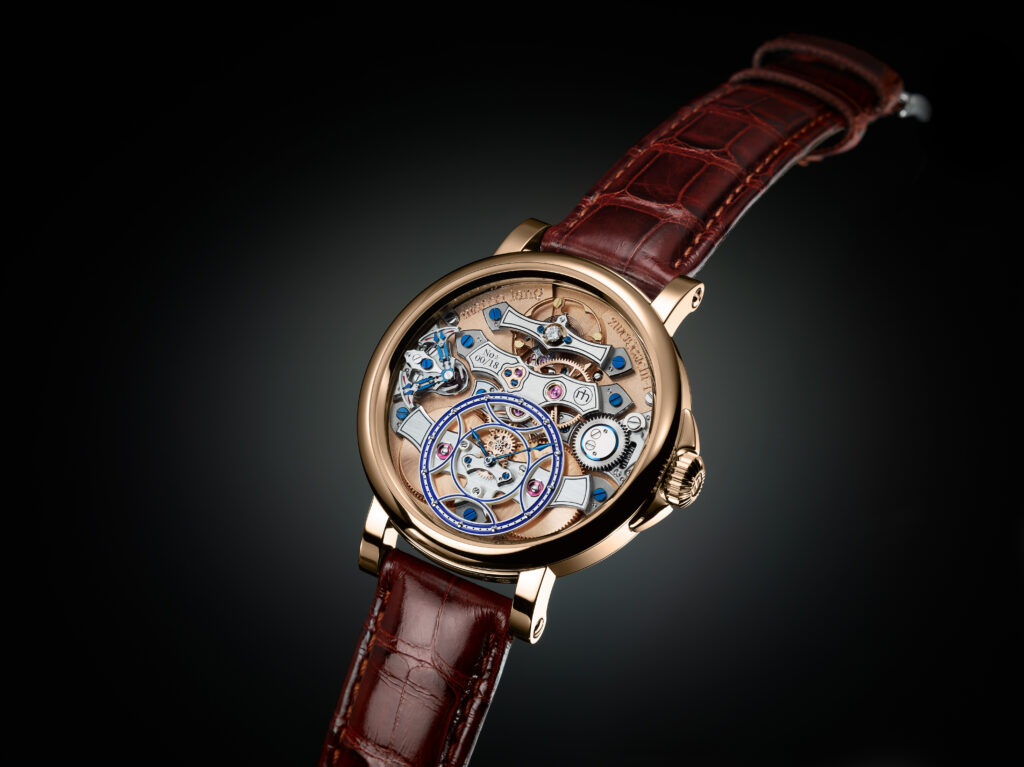 The back of the watch is a lot more intricate. It appears as though a lot is going on at first glance, but it’s actually a very artful expression of the fundamentals of telling the time. At 12 O’clock is the balance wheel, which has a diamond on it, underneath which is an Incabloc shock protection system. The balance wheel oscillates at 3Hz, and the hairspring has a Breguet overcoil for improved accuracy in the long run.Â
