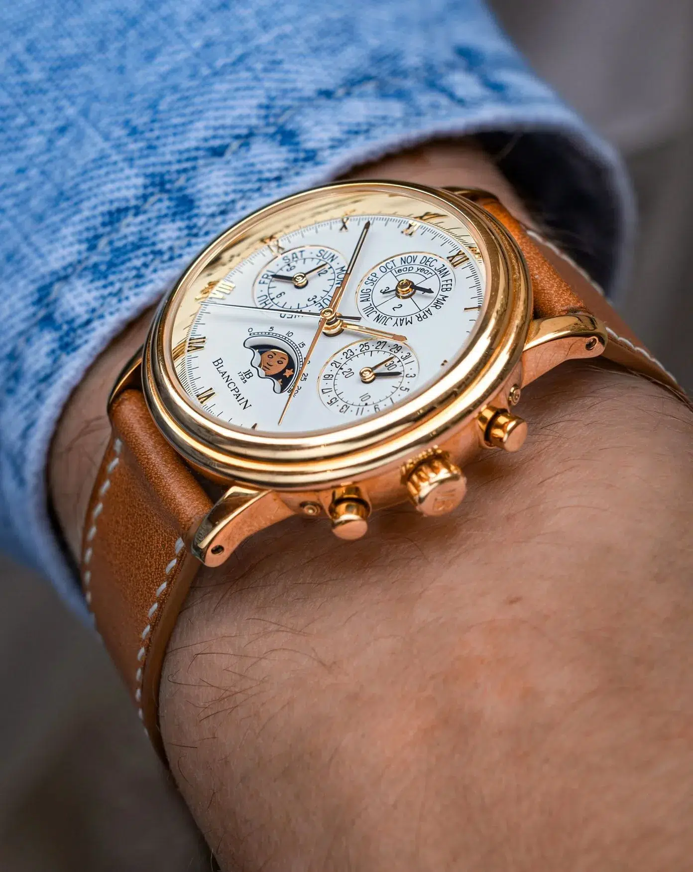 The 1990s were a decade of horological bravado. Brands wanted to prove they could build anything. Blancpain, under Jean Claude Biver’s direction, became famous for bringing back mechanical complications. The 5581 is a poster child of that era: a perpetual calendar combined with a split seconds chronograph.