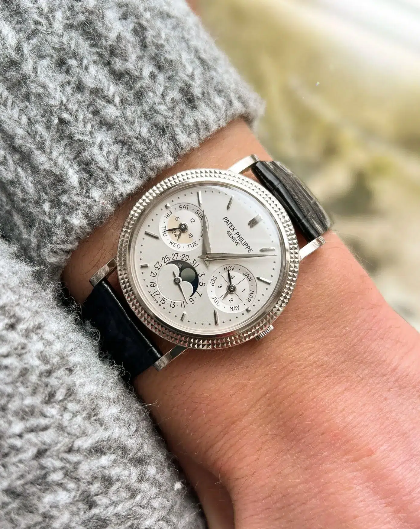 The 5039 is Patek Philippe in its most classic form. It is a perpetual calendar powered by the calibre 240 Q, wrapped in a discreet 35 mm case with a hobnail bezel.