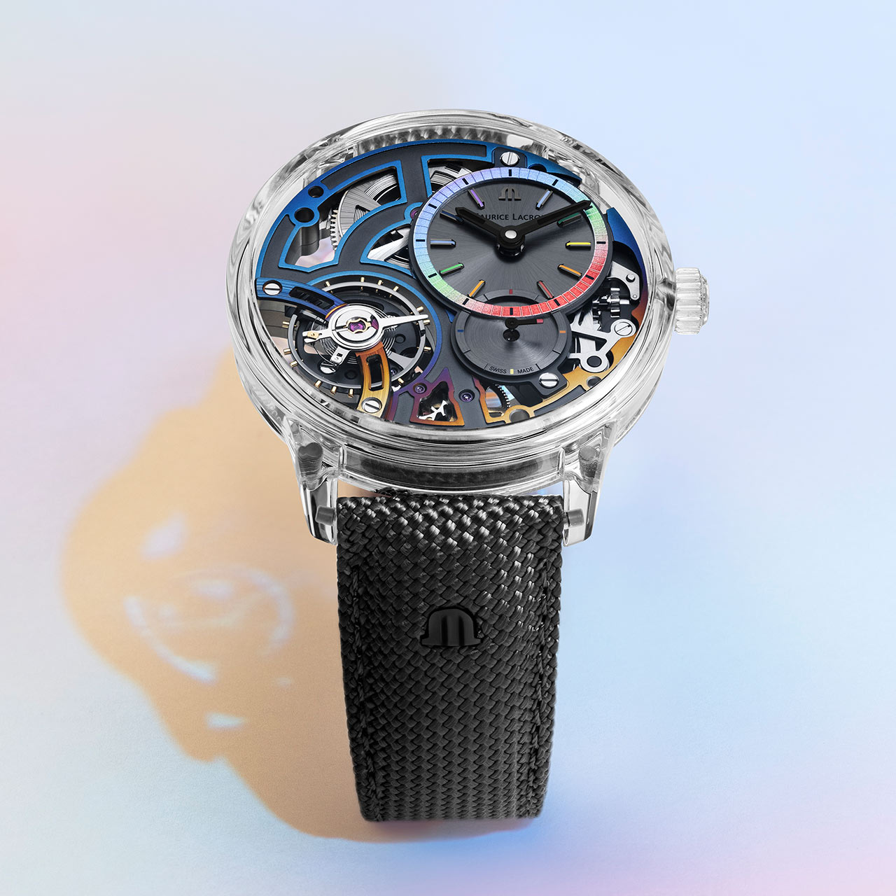 The watch is housed in a 43mm sapphire case, a first for the Maison. The sapphire case allows for unobstructed views of the skeletonized movement, which is the Manufacture Calibre ML330. The movement is decorated with a rainbow motif, which is a nod to the work of artist Victor Vasarely, who was one of the inspirations for this year’s Only Watch.