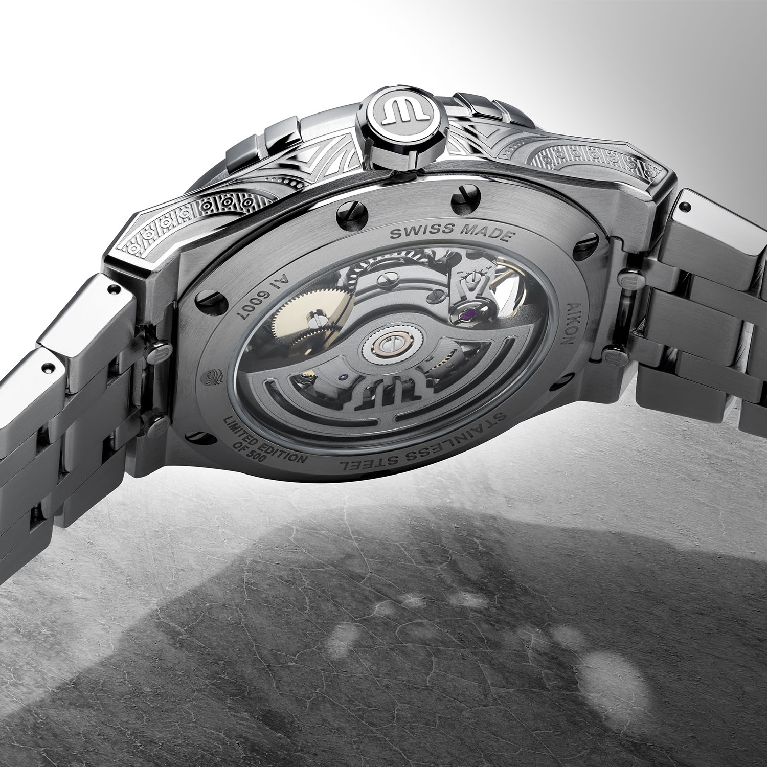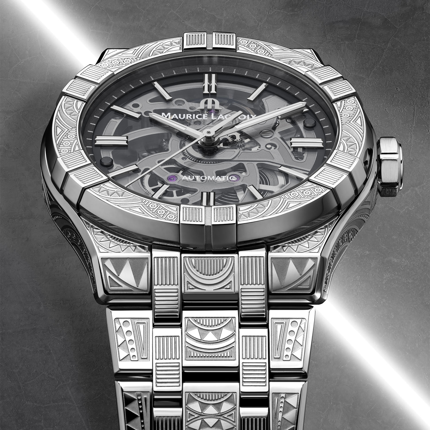 This watch combines the classic design of the Aikon with a skeletonized movement and a case and bracelet that are engraved with a modern tribal motif. The 39mm x 11mm case of the Aikon Skeleton Urban Tribe is a barrel-shaped stainless steel case that maintains the iconic design elements of the Aikon series such as the raised bezel with its characteristic six double-claws. However, what sets this timepiece apart is its meticulously engraved exterior. Drawing inspiration from modern architecture and Maori tattoos, the case and bracelet display an intricate pattern that adds a contemporary edge. Sapphire crystals cover the timepiece on both sides with a screw-down crown, offering a water resistance of 200 meters.