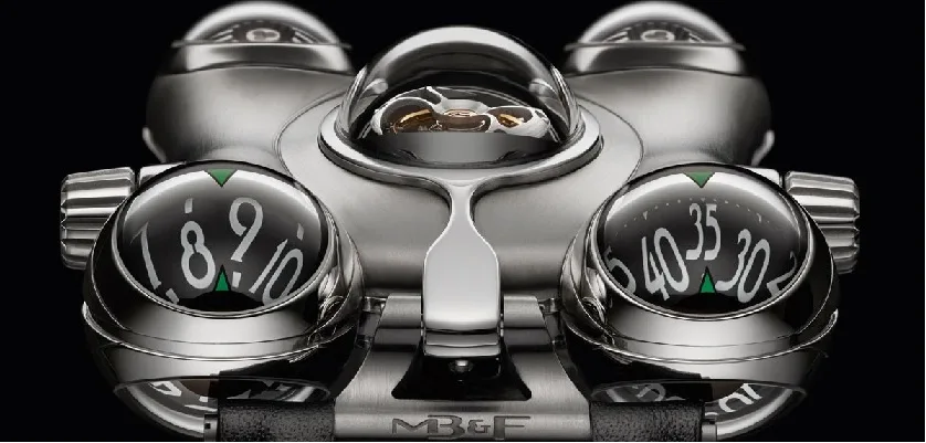 If we look at the watch we can see that it’s split up into 5 different bubbles or domes. The two at the bottom display the time, the dome on the left showing hours and on the right minutes. In the central dome is a flying tourbillon and it’s been decorated to look like it’s been clamped down at the top and bottom of the watch. Then there’s the twin turbines at the top. They don’t really serve a purpose other than decoration but they’re cool all the same. They’re connected to the special movement inside the watch which means they’ll spin when the automatic rotor does.