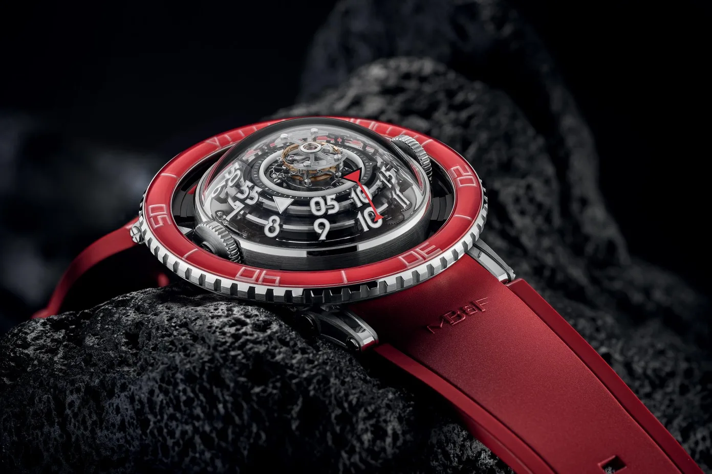 The reason for the red colouring, MB&F explains, is that it’s all relative to the depth of the ocean and the jellyfish that the Aquapod’s design is based upon. As you get deeper into the sea, you’ll find that it gets darker as the ocean blocks out the sun’s rays. But, the sea is doing more than just blocking all light in one go, it filters out the different colours too. That’s because visible light colours are made up of different wavelengths. Red light has a long wavelength with low energy behind it. It has a very long range in our atmosphere, which is why motor vehicles use it in their rear lights. However, underwater, red is the first colour to disappear in as little as 15 feet as its low energy waves are not enough to pierce through the water, which is significantly more dense than air.