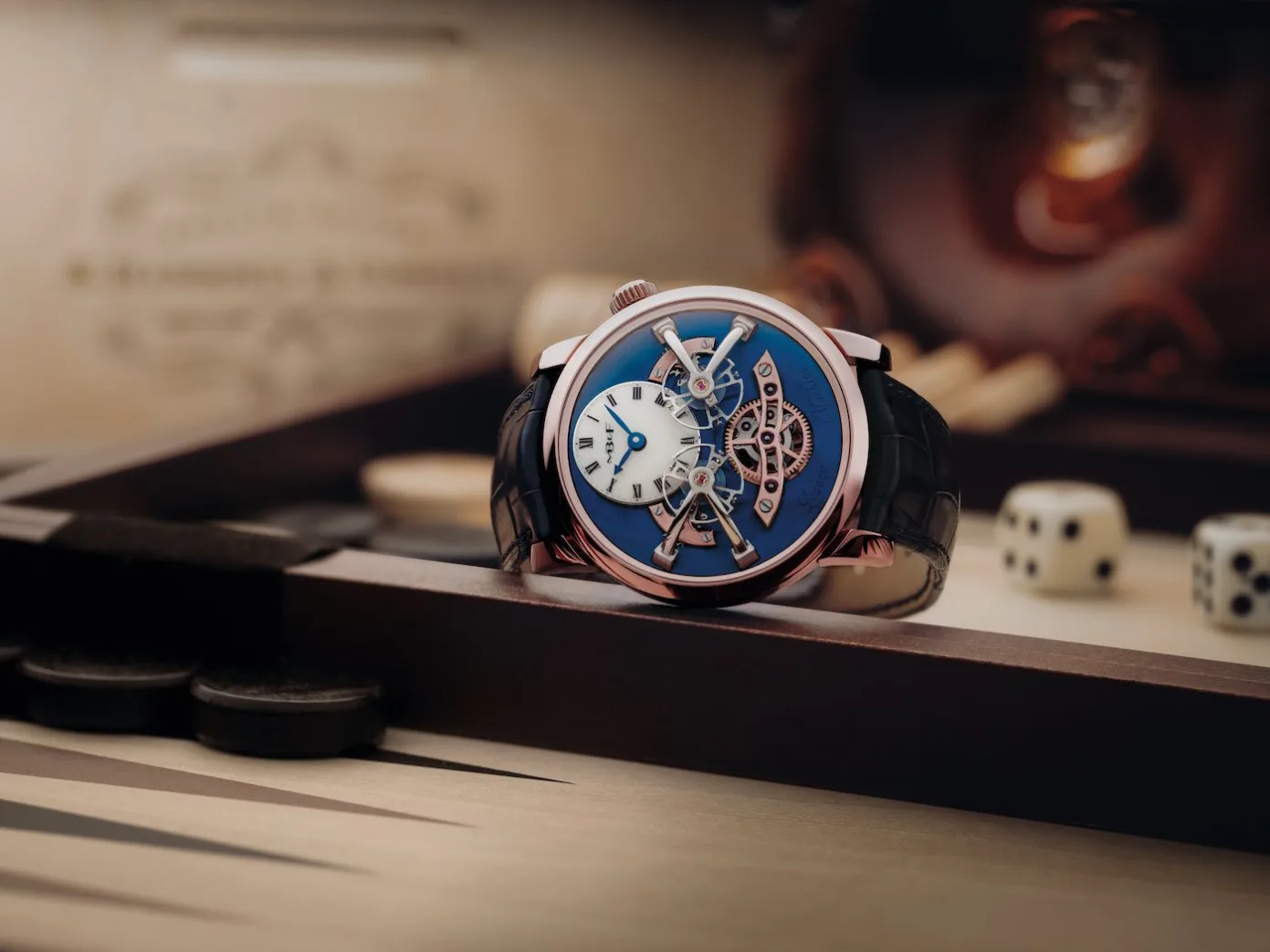 This particular version is quite a sad one, as it marks the last ever Legacy Machine to be made from 18K red gold, which was used on the first edition. The case is large, measuring 44mm by 19mm, and has a water resistance of just 30 meters. Underneath the sapphire crystal on the dial side sit the twin balance wheels and their exposed coupling system, and the hours and minutes are partially hidden underneath at the 12 o’clock position. The charismatic blue colour of the dial is achieved using a process called Chemical Vapour Deposition (CVD), and it has a light sunburst effect to help play with the light. Of course, the highly polished escapements do a grand job of that anyway, but a little more glitz never hurt anyone now did it?