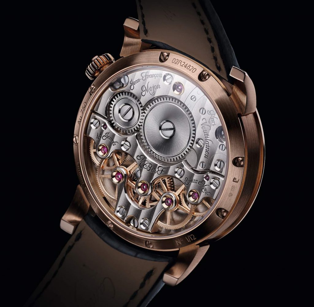 The LM2 is characterised by the dual balance wheels suspended over the dial. What do these do precisely? Well, they aim to reduce the timing errors of the watch. Connected via a planetary gear differential which is visible on the dial, the two balance wheels and their assemblies are mirror images of each other, meaning that when MB&F makes one assembly they must then make the other in reverse. The genii behind the LM2 are Kari Voutilainen and Jean-François Mojon of Chronode. Together, they developed the 3D movement architecture and the coupling system for MB&F.
