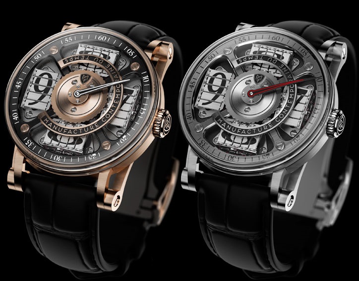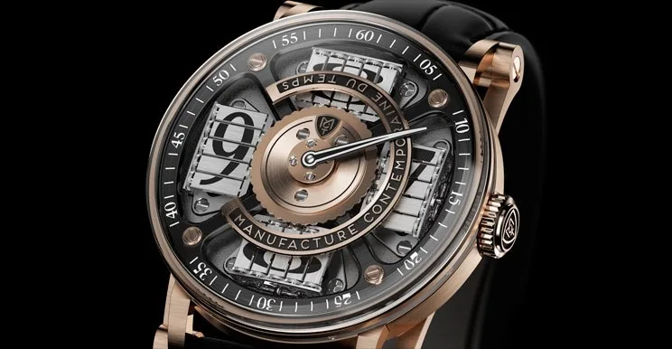 The automatic-winding movement with 18K gold micro-rotor was developed in-house by MCT. Highly legible hours are indicated by four modules, each comprising of five triangular prisms. The current hour is highlighted by an open ‘window’ in a ‘C-shape’ arc around the center of the dial, which is relief- engraved with « Manufacture Contemporaine du Temps » (MCT).