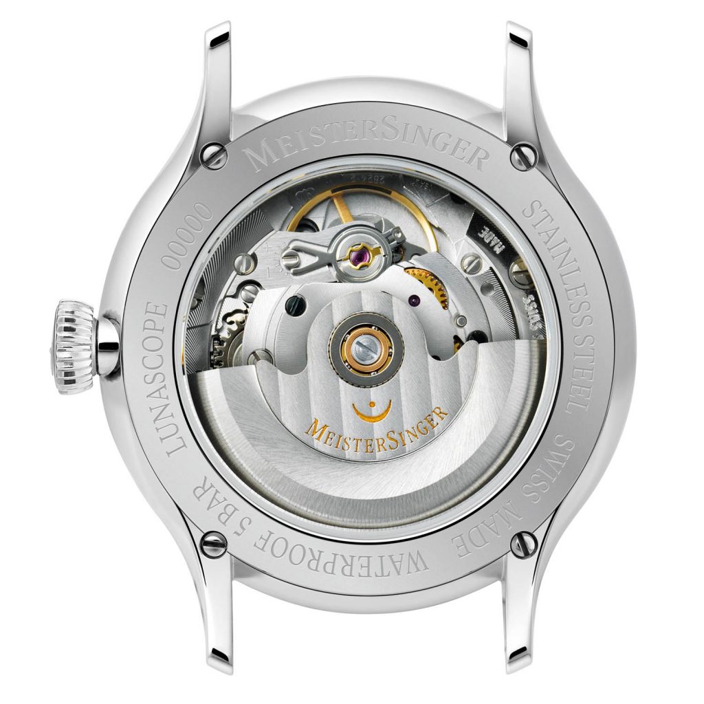 The case on the Meistersinger Lunascope is made from stainless steel and measures a modest 40mm in diameter, which along with the slightly downward curving lugs should make it sit comfortably on a variety of wrists. A sapphire crystal sits on top of the case and is held in place with a relatively thin bezel which leads to a larger dial opening in turn providing more real estate for the wearer’s eyes to enjoy. The case back also gets a transparent treatment and gives a nice view of the mechanical internals that drive the watch. The case is water resistant to only 50 meters which is apt for a watch of this type.