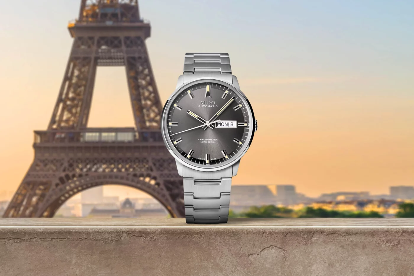 Inside the watch is the self-winding Calibre 80 Si, which is also known as the ETA C07.821 or the Powermatic 80. It has a silicone balance spring and a power reserve of 80 hours. The caseback is engraved with an outline of the Parisian skyline and ensures a 50m water resistance.