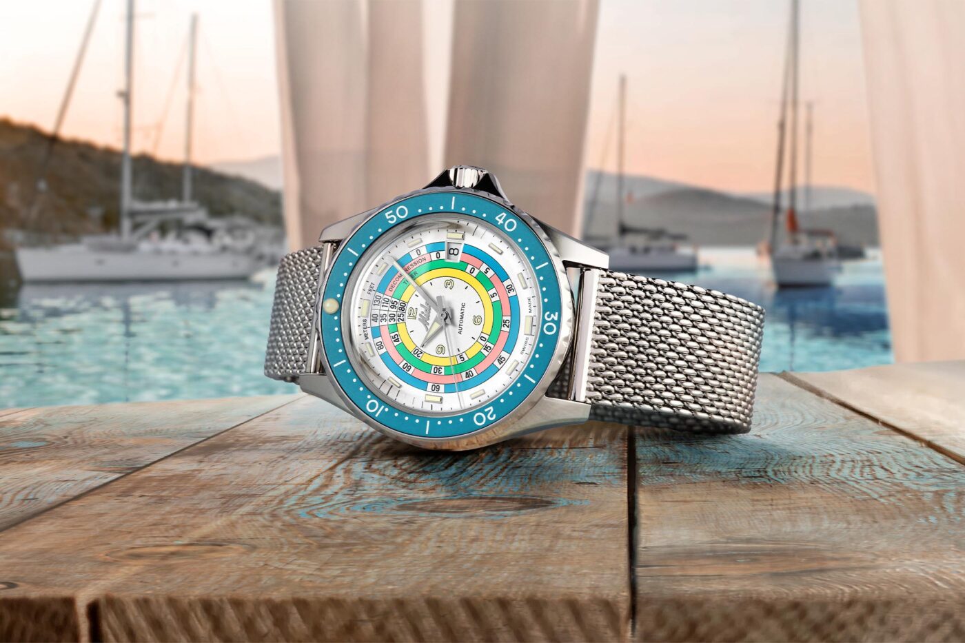 Like last year’s release, the first thing that grabs attention on the Ocean Star Decompression Timer 1961 “Turquoise” Limited Edition is the multicolored dial. Presented with a silvery-white base, the dial is characterized by concentric, colorful rings, that feature decompression times at different depths. The central section of the dial features a printed hour index with Arabic numerals at 12,3,6 and 9, which help in improving the legibility of an otherwise busy dial. Applied rectangular indices, along with a black printed minutes track, cover the outer periphery, and there is also a trapezoidal date window at 3. As for the hands, you still get the broad arrow style short hour hand, an elongated baton-style minute hand, and a simple stick style seconds hand. The hands, along with the indices, have been filled generously with luminous paint to make it possible to read the time in dimly lit situations.