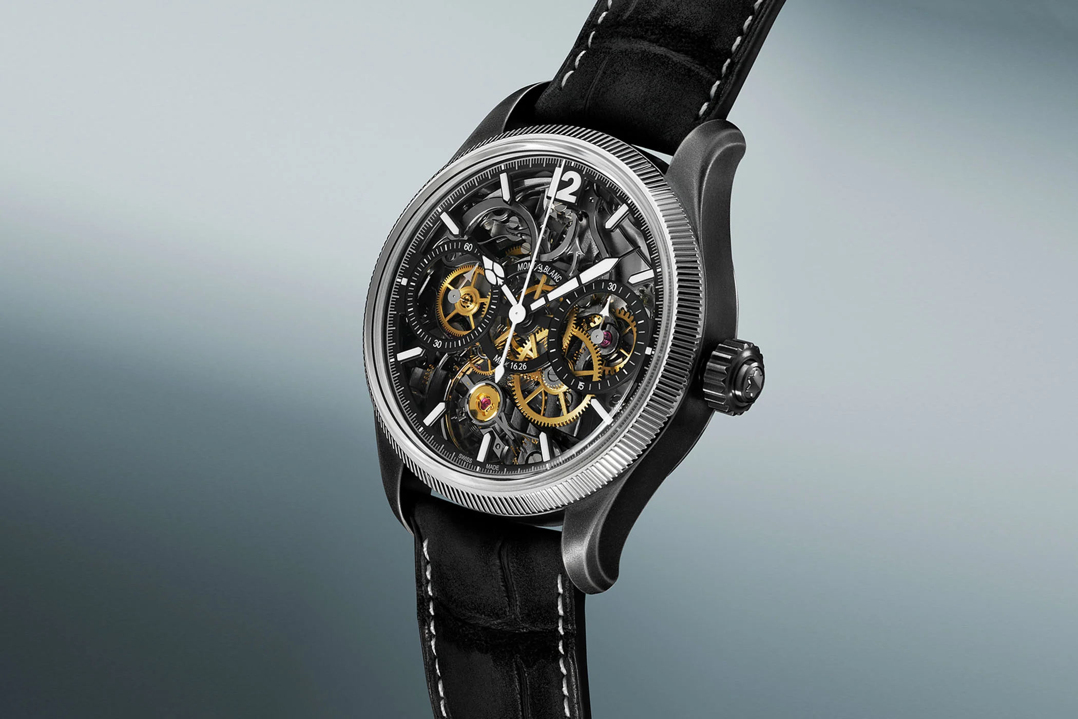 The MB16.29 caliber powers the watch, with a manual-winding movement, power reserve of 50 hours, 18,800vph frequency, and is fitted with a column wheel and horizontal disc clutch. The sanded German silver plate with circular graining, silver bridges with Geneva stripes, and gold-plated going train make for a visually stunning watch.