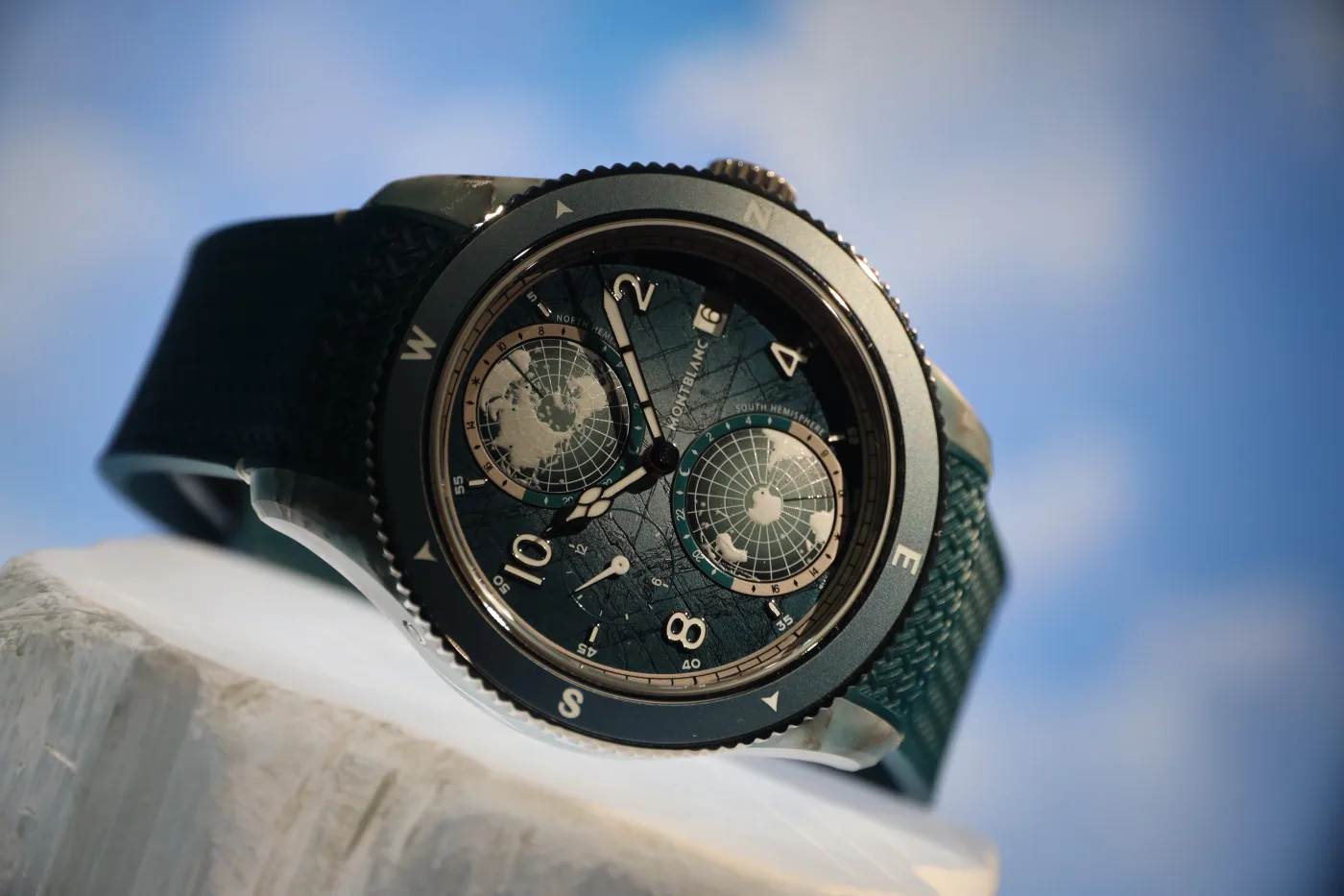 First up, the case is a sturdy bit of kit measuring 43.5mm x 13mm, fashioned from titanium, with a rather peculiar composite middle section incorporating quartz fibres, aluminized basalt fibres, CaCO₃ and a light blue resin. Turning our peepers to the dial, there isn’t one in the traditional sense; instead, you get rotating Northern and Southern Hemisphere globes, alongside a 24-hour scale, day/night indicators, a dual time display and a date window. Powering this piece is the MB 29.25 automatic movement, boasting Montblanc’s in-house worldtime complication, ticking away at 28,800vph. It’s strapped onto a blue-green interchangeable rubber number with a taper and a fine adjustment system. This one’s a limited run of 986 pieces and it’ll set you back $9,400.