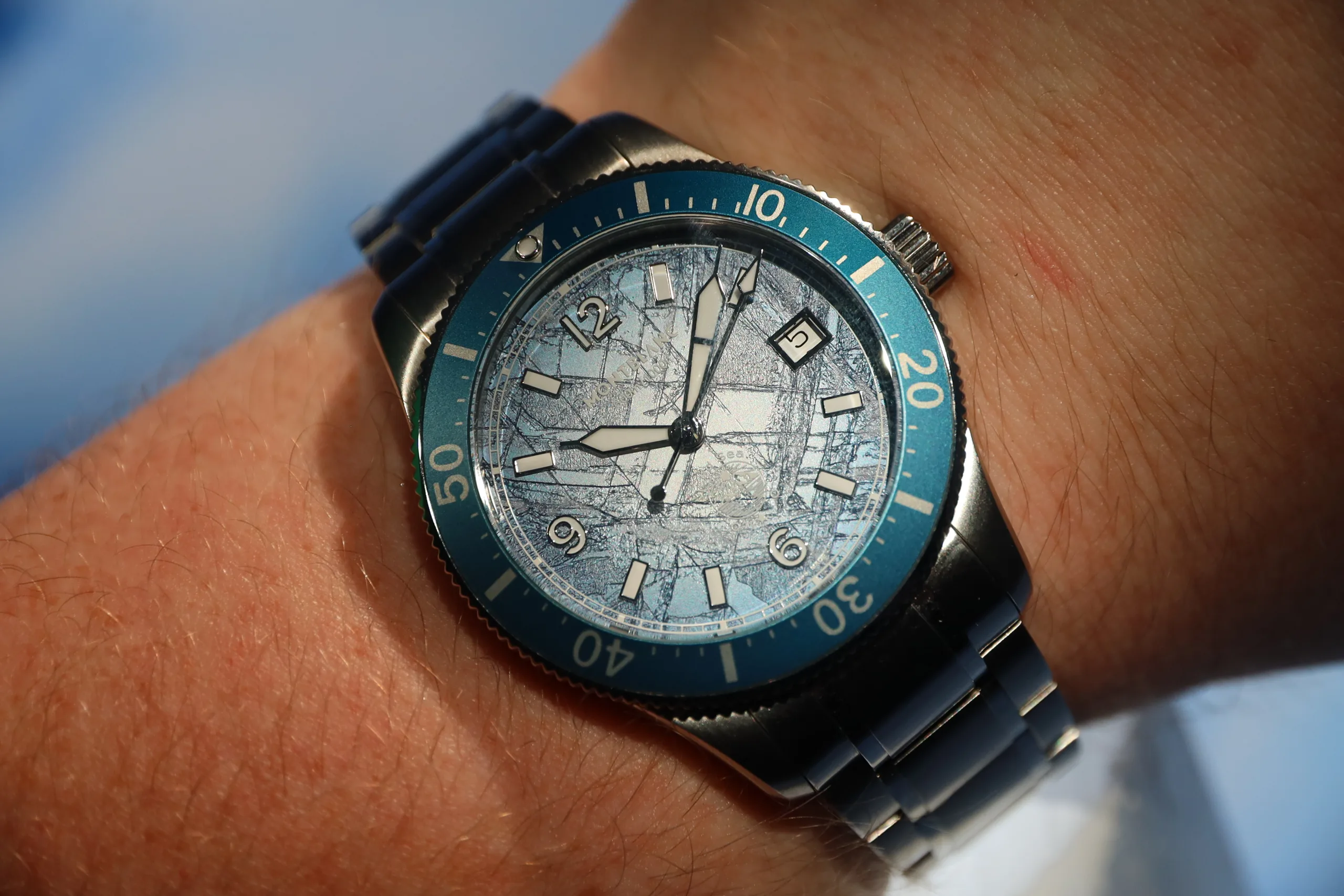 Next up, we’ve got a blue sfumato glacier pattern dial on this. The case here is a more modest 38mm x 12.2mm, hewn from stainless steel and totally devoid of oxygen. The dial, mimics the depths of a glacier through an age-old gratté-boisé technique. Encircling it is a unidirectional rotating bezel with a two-toned blue anodized aluminium insert. Inside, the self-winding automatic movement ticks along at 28,800 times per hour. This one comes on an interchangeable stainless steel bracelet, complete with a fine adjustment system. It’s priced at $3,660 and doesn’t appear to be a limited edition, readily available for those inclined.