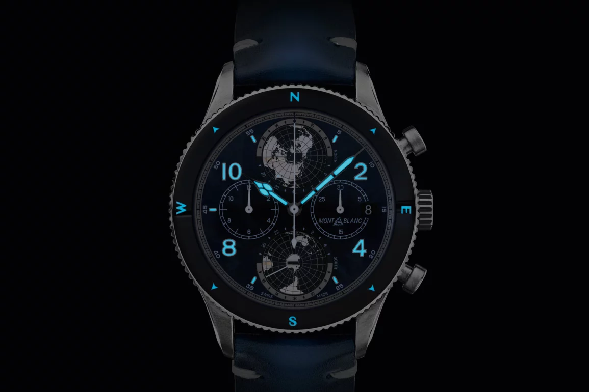 The watch has a 44mm brushed titanium case which seems rugged, although if Montblanc was really serious about this being an outdoors watch they should have added some guards for the crown and pushers. The dial should be easily read, though, the large geospheres which depict accurate time in either hemisphere are the standout features. Even the subdials seem to stand out against the blue dial which is inspired by icy glaciers, the guilloché used to create this effect is called gratté boisé.