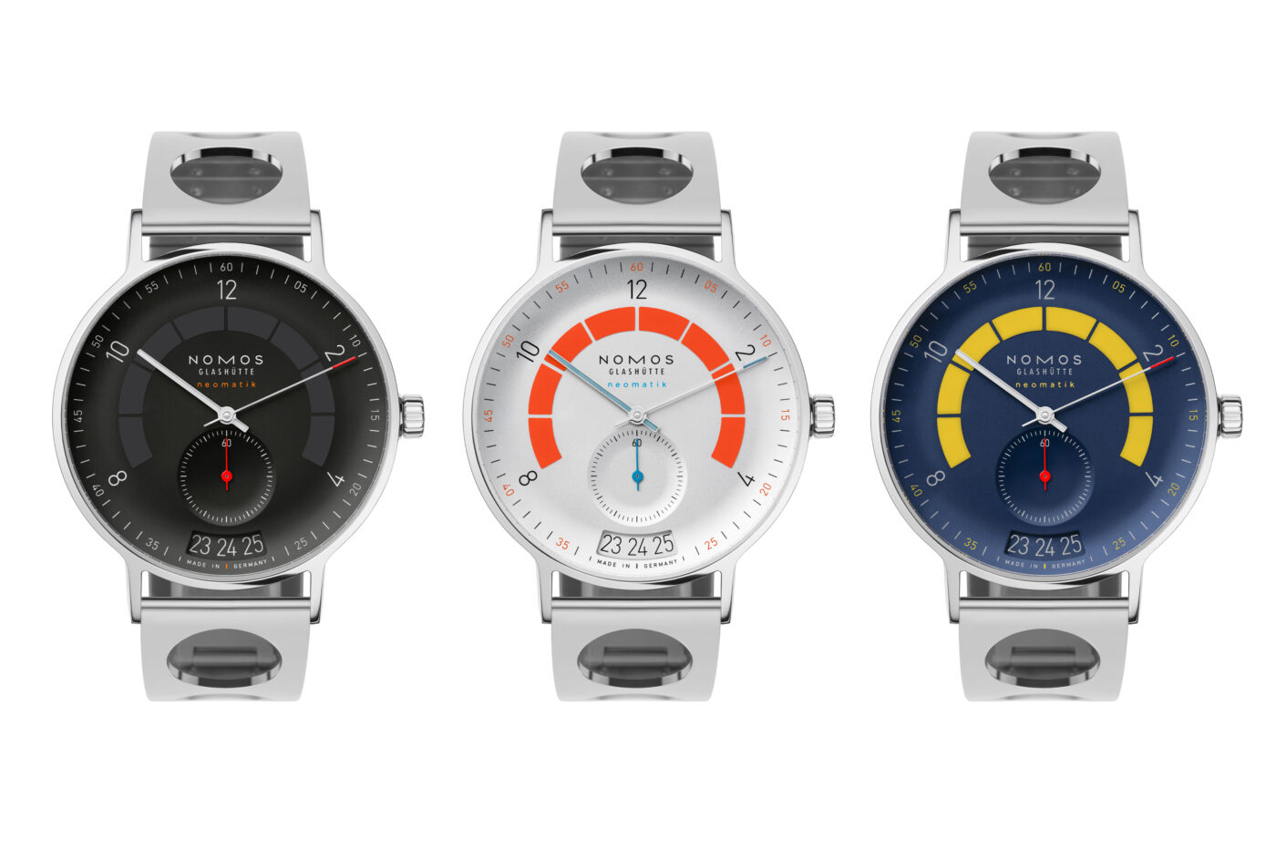 Nomos worked with German-born designer Werner Aisslinger to bring these pieces to life. All of them feature a stainless steel case measuring 41mm x 10.5mm with a water resistance of 100m. They also feature a date at 6 O’clock and a small seconds hand. The splash of colour between 8 & 4 represents the instruments found in classic cars, giving the Autobahn a sporty impression.