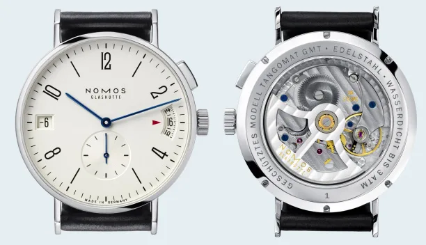 This is the NOMOS Glashütte Tangomat GMT. This watch comes in a 40 mm by 11 mm stainless steel case with a domed sapphire and sapphire crystal caseback. The hour, minute and small second hands are in blued steel. The hour markers are printed with 2, 4, 8, 10 and 12 marked by Arabic numerals. A red arrow at 3 o’clock points to the current home time, which is represented in 24-hour military format.