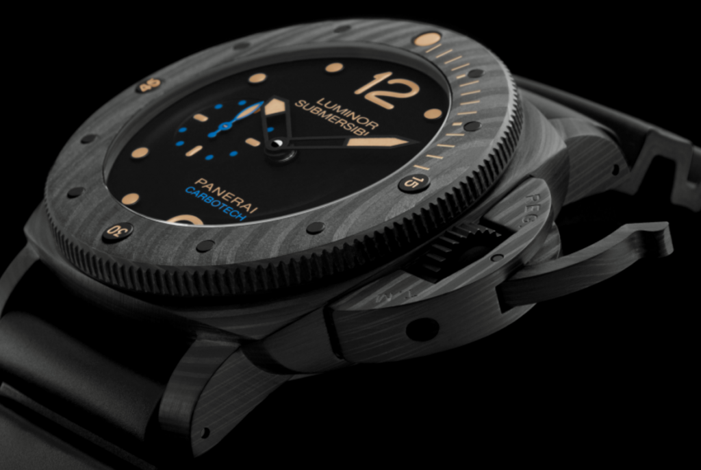 One year later Carbotech was launched for a few collections, notably (and also my favourite version) the Luminor 1950 Submersible Carbotech PAM00616 diver. Carbotech is a very light and hard material which is very suited to wristwatches, though when I asked about how likely it is to shatter in comparison to ceramic the answer was more or less they don’t really know given the molecular structures of the two different materials.