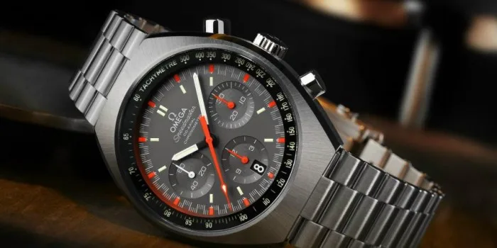 This watch is the reintroduction of the original 1969 Omega Speedmaster Mark II, a timepiece with polished facets and brushed surfaces on the tonneau-styled case, just like its predecessor. The reintroduction version of this classic timepiece has been updated to include an automatic mechanical movement and luminous tachy scale. The watch will be offered in two versions: a black dial, and the grey “racing” dial with orange accents.