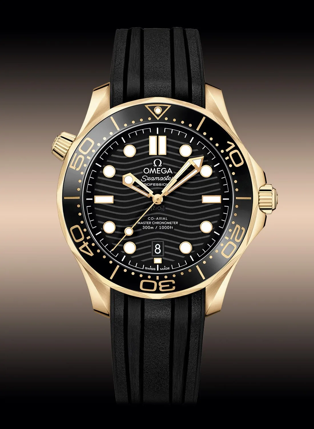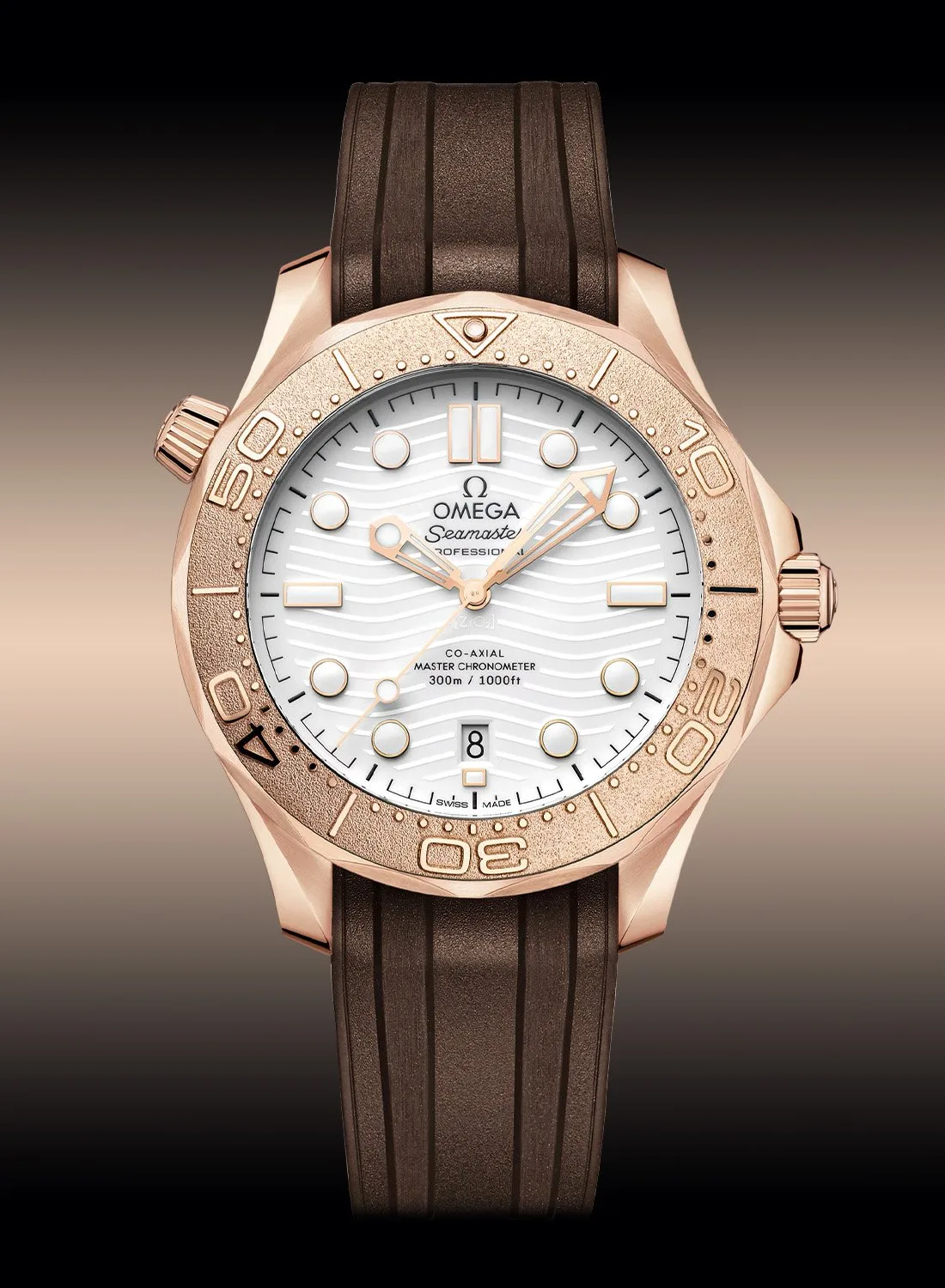 The Sedna Gold version is the dressier of the two, crafted from Omega’s proprietary rose gold alloy, a grain-textured gold bezel with raised diving scale and a polished white ceramic dial with those signature laser-engraved waves. The hands and markers are also Sedna gold and it’s strapped on brown rubber for a slightly softer, upscale vibe.