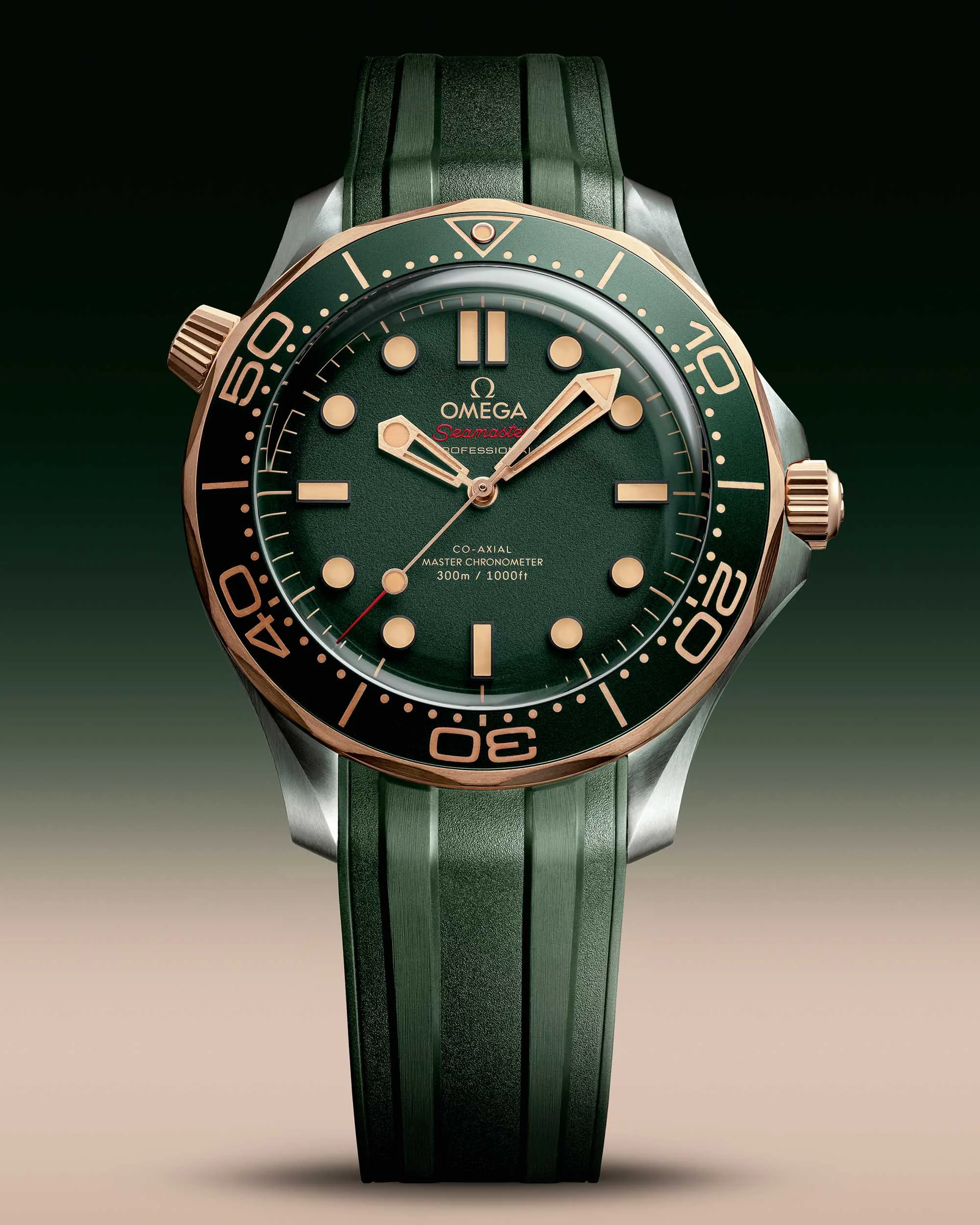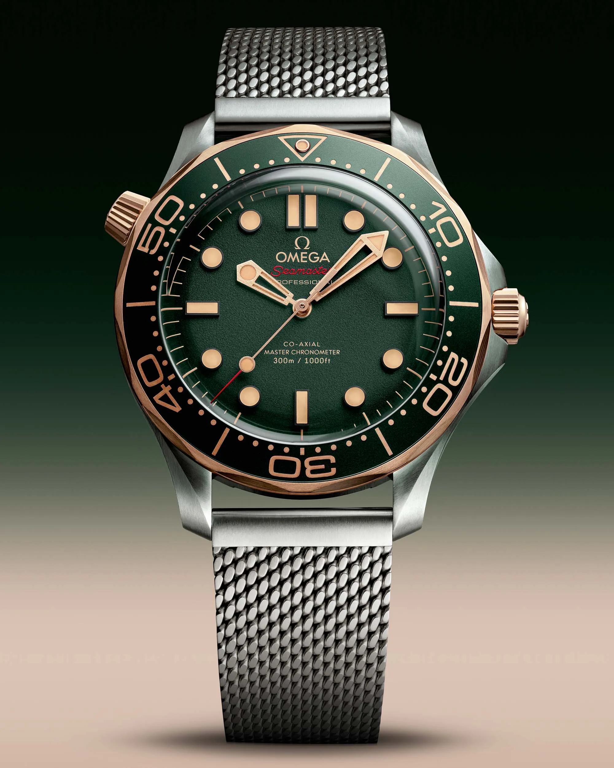 This Omega Seamaster Diver 300m comes paired with a grade 2 titanium mesh bracelet ($10,700 USD) or an integrated green rubber strap ($9,900 USD).