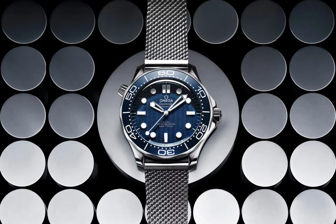 The bezel and the dial are fashioned with blue oxalic anodized aluminum, and the bezel has a diving scale filled with white Super-LumiNova. The diving scale’s conventional inverted triangle has been replaced by a ceremonial “60”. The dial has waves that have been laser-engraved and a glowing green dot that connects to the minute hand. It has a mesh-style bracelet, The watch itself takes its design cues from the Seamaster that 007 wore in GoldenEye. Presented in the original Diver 300M wave’s blue wooden presentation box, which has three dots reminiscent of the iconic Bond opening title sequence and a hidden push button on the right.