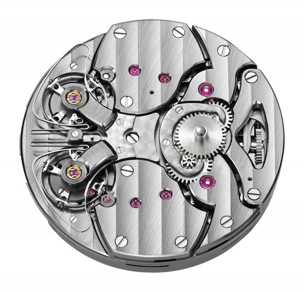 The calibre ARF16 is visible on both the front and back of the watch. The front has the twin escapements, a small seconds dial which has been coloured the shade of blue that OnlyWatch is using as its theme this time around, and the primary time dial as well. Of course, there’s some glorious striping to view as well. Around the back, there isn’t a whole lot of action going on, but you can see some more of that stripe polishing and the twin mainspring barrels as well. Those two barrels provide a power reserve of 48 hours at the operating speed of the escapements which is 3.5Hz. There are also 38 jewels in the movement and a total of 206 components.