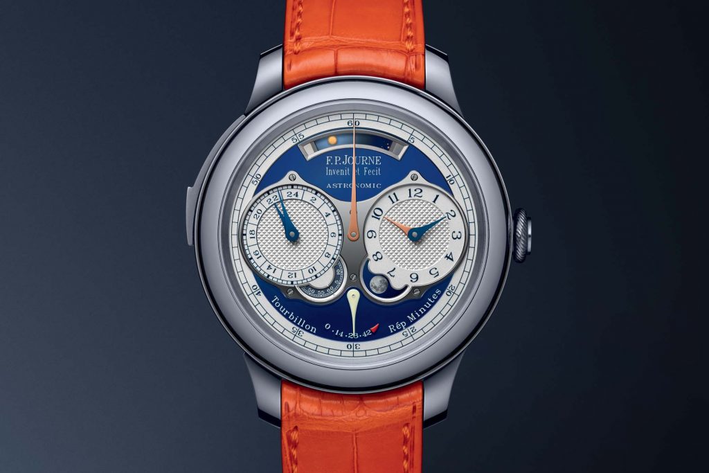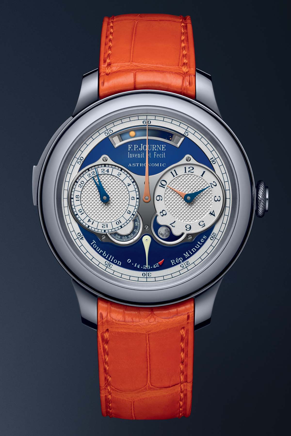 The case is made of Tantalum, another F.P. Journe hallmark. Tantalum is overall a deeper colour than most white metals, taking on a dark grey or even a blue hue in the right lighting. It, along with the chrome blue dial are also found on F.P. Journe’s ever-popular Chronomètre Bleu watch. It measures 44mm in diameter and 13.75mm thick, impressive considering everything that’s inside. The watch also features a distinctive orange leather strap as we saw on 2017’s Only Watch edition, which works really well with the blue colouring going on with the dial.