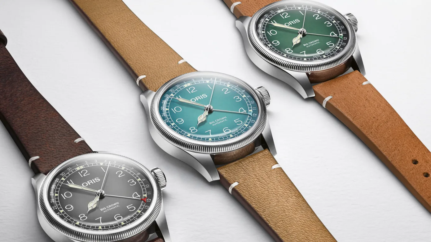 The Oris Big Crown Pointer Date goes back to 1938 when pilots required an oversized crown that could be used with gloves. Signature features included oversized Arabic numerals, cathedral hands and an extra central hand that pointed to the date around the dial’s perimeter. There was an absence of the model for some time, but the design returned in 1984 and has become a major collection for the brand. There have been some contemporary variants, but these new models are true to the traditional styling.
