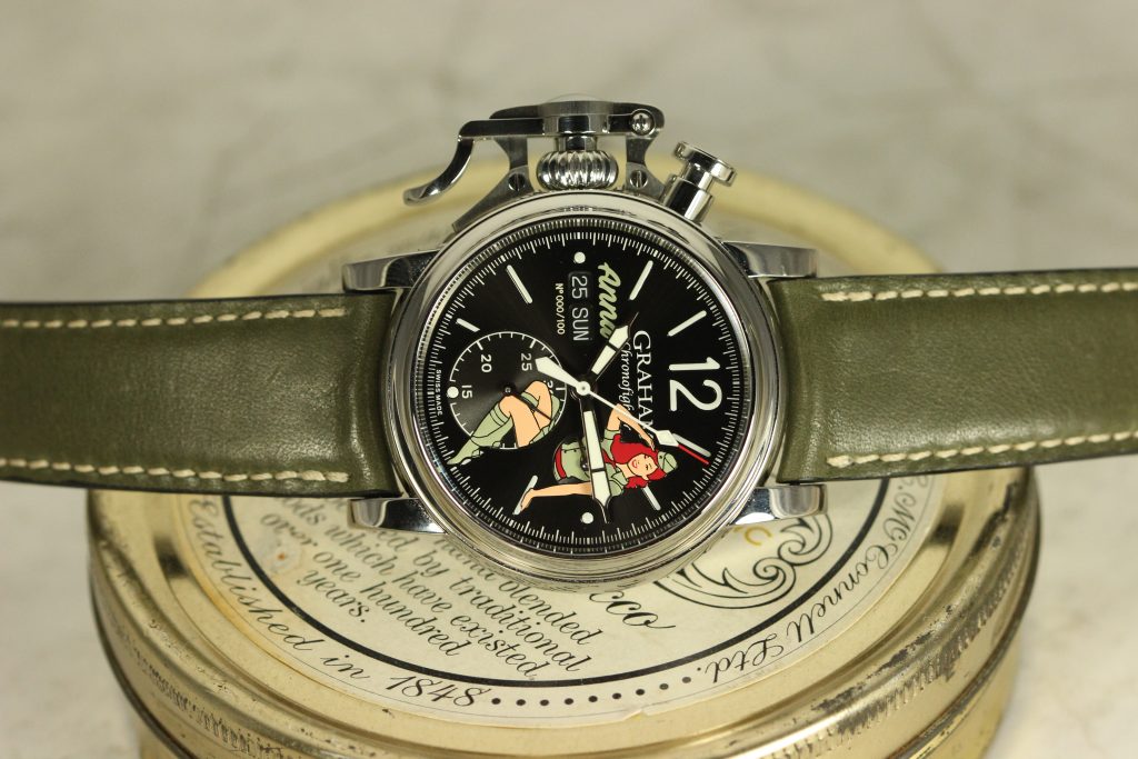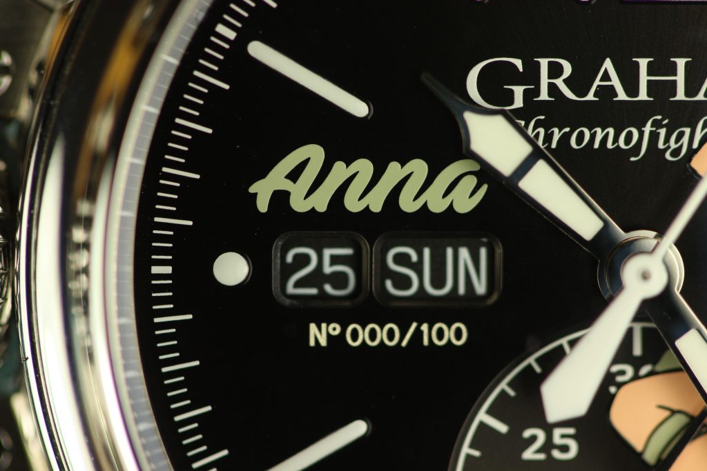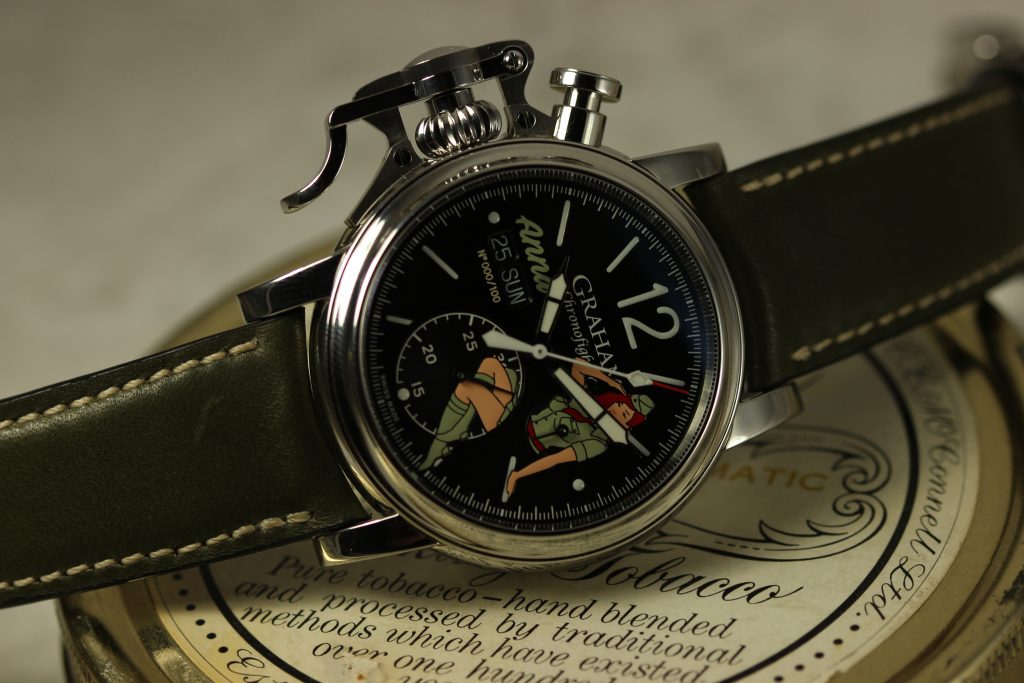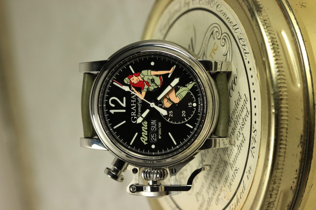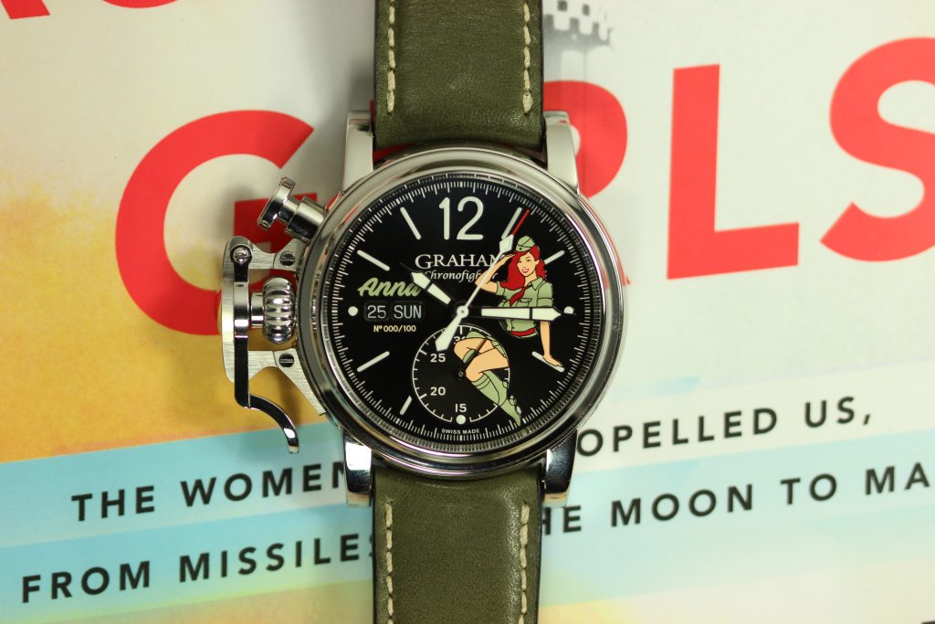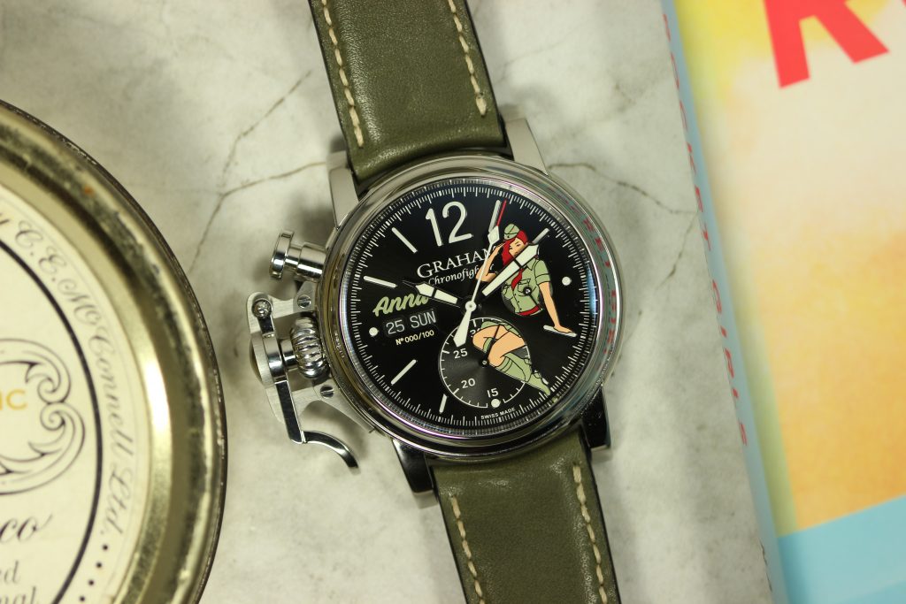 All watches in the Graham nose art collection are powered by the Caliber G1747, a Valjoux 7750 base with a customized Graham branded rotor visible through the sapphire case back. The finishing of vertical Geneva stripes and the circular Cotes de Geneve are pretty standard for chronographs in this price range, however, I believe that the real selling point of the watch is its unique case and dial. The ‘Anna’ I wore last year was fitted with a military green strap that matched the green of Anna’s uniform and contrasted nicely with her vivid red hair. Other watches offer different colors like the navy blue of Nina or the jet black (with pink highlights) of Sally.