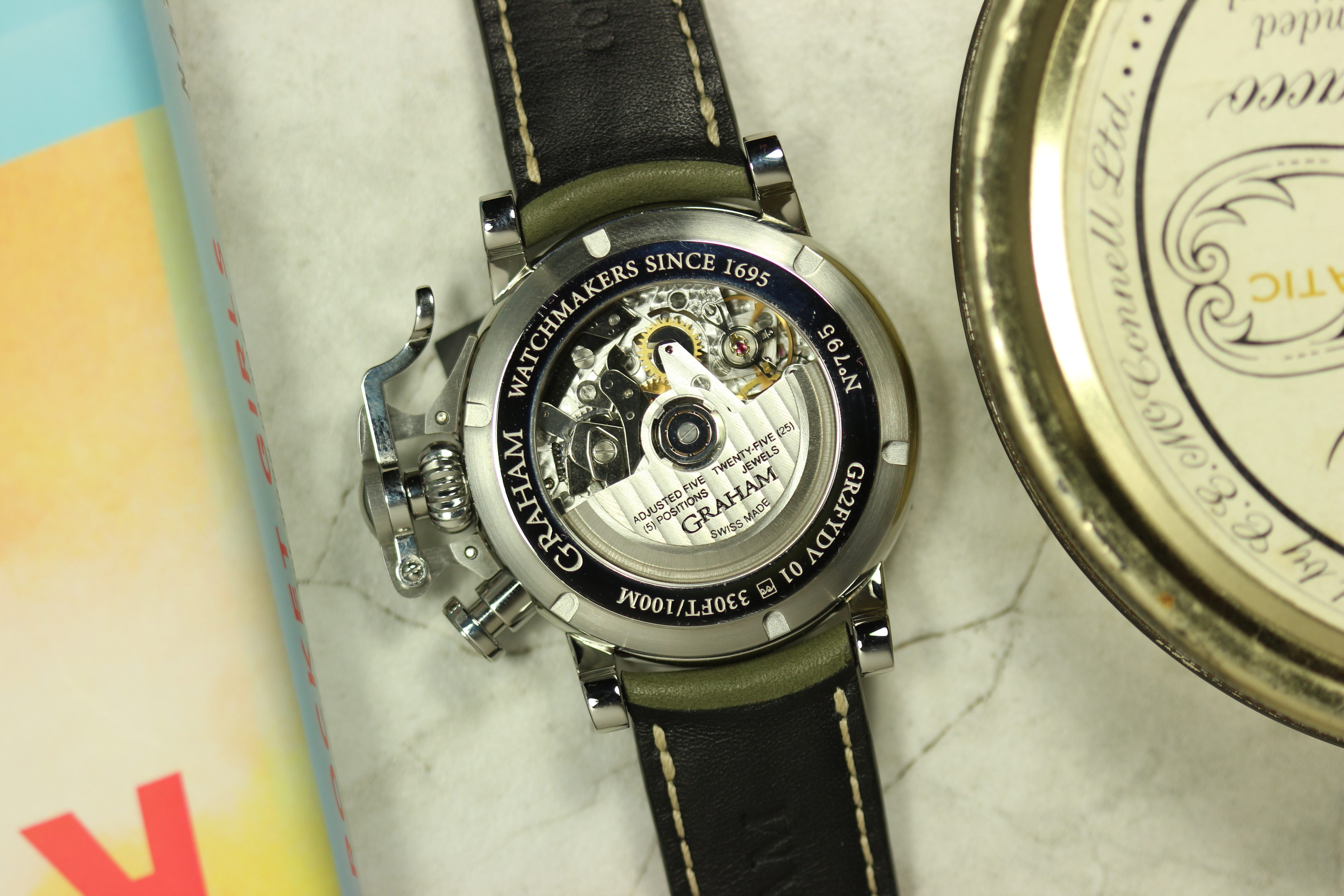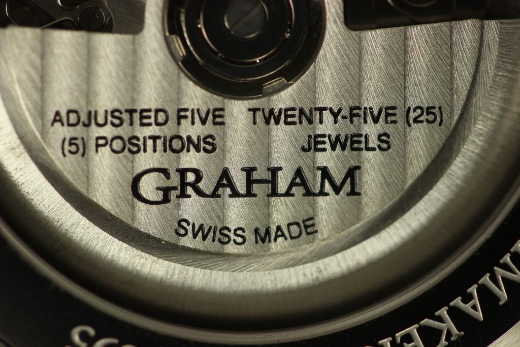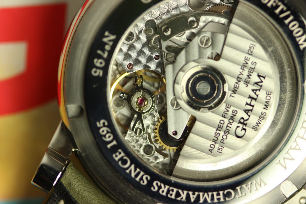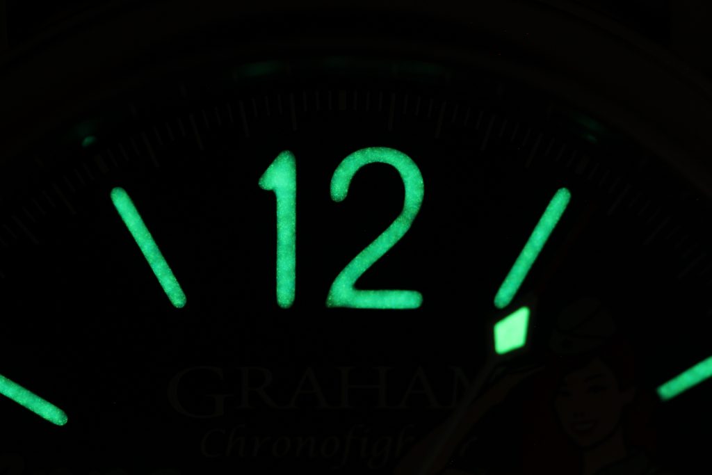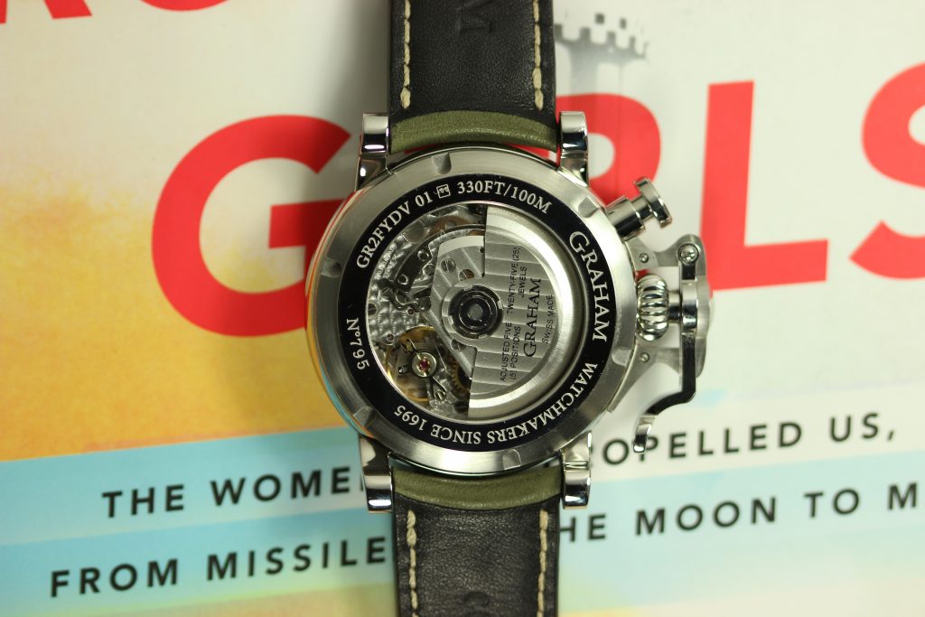 All watches in the Graham nose art collection are powered by the Caliber G1747, a Valjoux 7750 base with a customized Graham branded rotor visible through the sapphire case back. The finishing of vertical Geneva stripes and the circular Cotes de Geneve are pretty standard for chronographs in this price range, however, I believe that the real selling point of the watch is its unique case and dial. The ‘Anna’ I wore last year was fitted with a military green strap that matched the green of Anna’s uniform and contrasted nicely with her vivid red hair. Other watches offer different colors like the navy blue of Nina or the jet black (with pink highlights) of Sally.