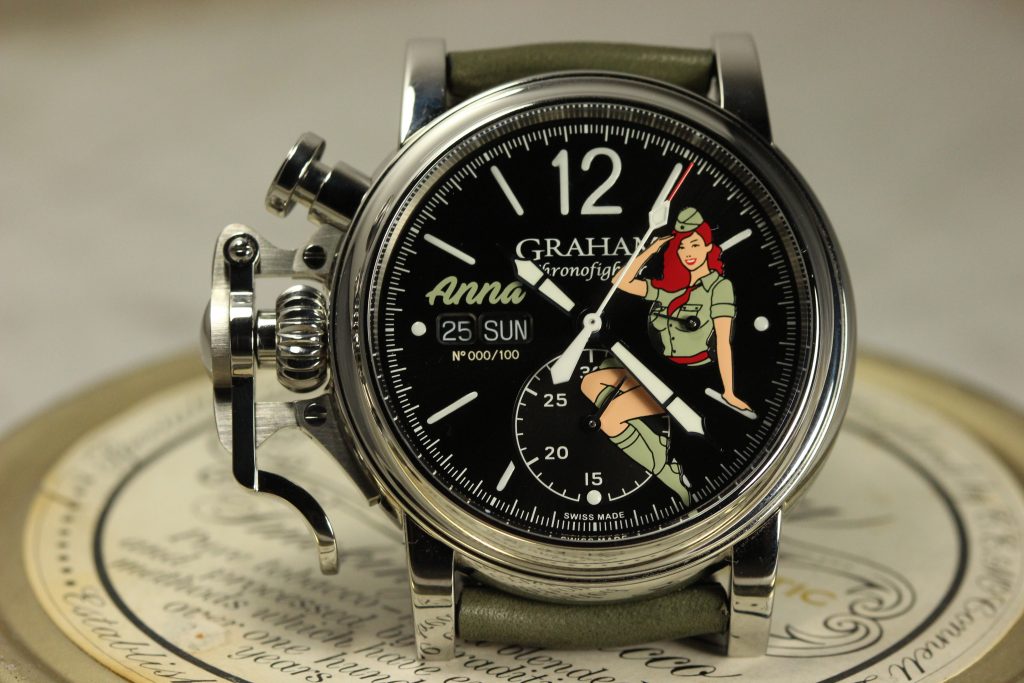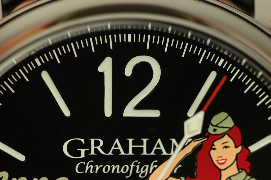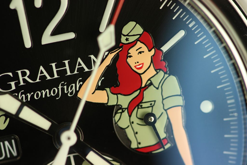 Military pilots have been painting the noses and fuselages of their planes ever since aerial combat existed. In World War I, German and Italian pilots painted imagery on their planes that aimed to terrify their allied enemies (as if dog-fighting itself wasn’t already terrifying enough!) but the trend really caught on in World War II with pilots of the American Army Air Force. Their plan was not to terrify their enemy, but to raise the morale of their own troops and what proved popular was paintings of scantily-clad women in provocative poses. It is these iconic works of military art that Graham has taken inspiration from for their watches.