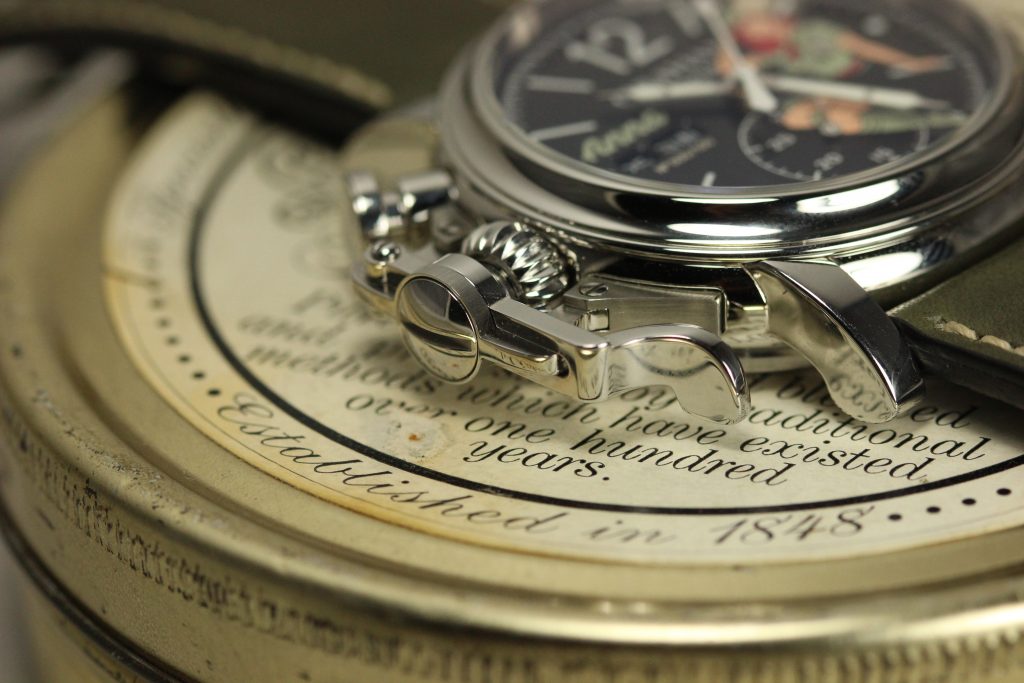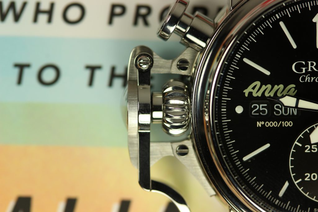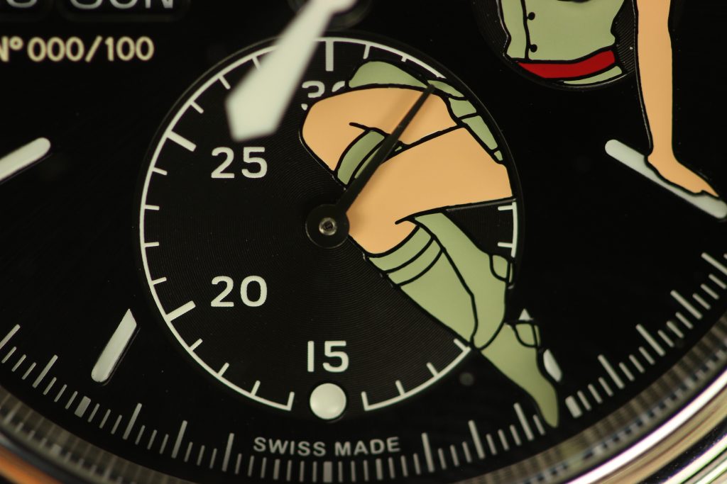 Last year I had some time with one of the nose art pieces (Anna) and I was surprised how wearable the watch was. At 44mm I wouldn’t describe it as svelte, but the down-turned short lugs did a lot to help the physical footprint of the watch seem smaller than it actually is. As a lefty, reaching over a watch to activate a chronograph worn on my right wrist is an annoyance I’ve learnt to live with so the change of pace with a left-sided chronograph with a big ol’ trigger to push was welcome. I rarely have a use for chronographs in my day to day life but the novelty of the trigger did keep my attention longer than a standard chronograph does. How right-handers will fair with the left-handed layout I don’t know!